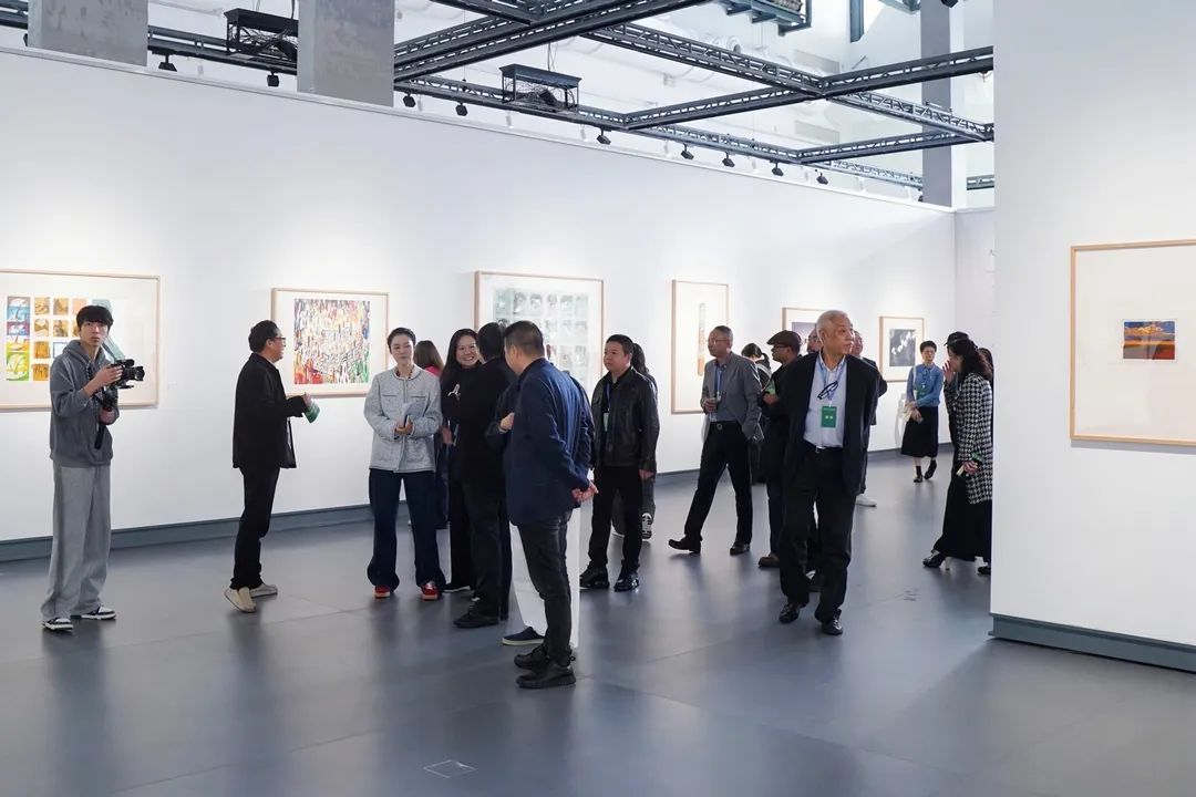 在开幕式上,广州美术学院党委副书记、中国美术家协会版画艺委会主任宋光智,中央美术学院版画系第二工作室主任祝彦春,宁波市鄞州区委宣传部常务副部长应林辉,华茂集团董事长助理、华茂集团艺术品收藏负责人、华茂社会事务发展委员会委员、艺术教育专业委员会主任徐钰程,西安美术学院院长、陕西省美术家协会主席朱尽晖先后进行了开幕致辞。其中,宋光智先生提到“中国丝网版画历经四十年发展,与社会变革、艺术创新同频共振。展览以200余件佳作,浓缩四十年成就,承上启下,开启丝网版画的新起点。愿以此次展览为契机,让更多观众感受到丝网版画的独特魅力,对促进我国丝网版画艺术在社会中的美育价值具有积极的作用”。徐钰程先生提到“2025年是华茂集团艺术品收藏第三十五载,华茂艺术教育博物馆开馆五周年。这些时间刻度,不仅丈量着我们在美育路上的耕耘,也呼应着中国丝网版画四十年的生长脉络——我们始终以‘艺术教育’为圆心,持续拓展实践的年轮。多年来,华茂集团围绕版画收藏开展了一系列学术研究、艺术共创、公共教育等活动,致力于打破艺术与公众之间的壁垒,使艺术从架上,走向观众手中可触摸、可共创的生动体验”。祝彦春先生在开幕式上提到展览所具有的文献性,“此次展览,一是探寻丝网版画保持前沿性、多元化发展路径的尝试;二是借此机会回顾与梳理丝网版画文脉的逻辑内涵,在几代的技术演进与流变中延展文化视野。我们期待在华茂站的研讨会中能进一步碰撞出智慧的火花,凝聚出有建设性的真知灼见”。随后,嘉宾们与华茂集团创始人、华茂教育基金会创始人、华茂美堉奖发起人、东钱湖教育论坛创始人徐万茂先生共同为展览启幕。