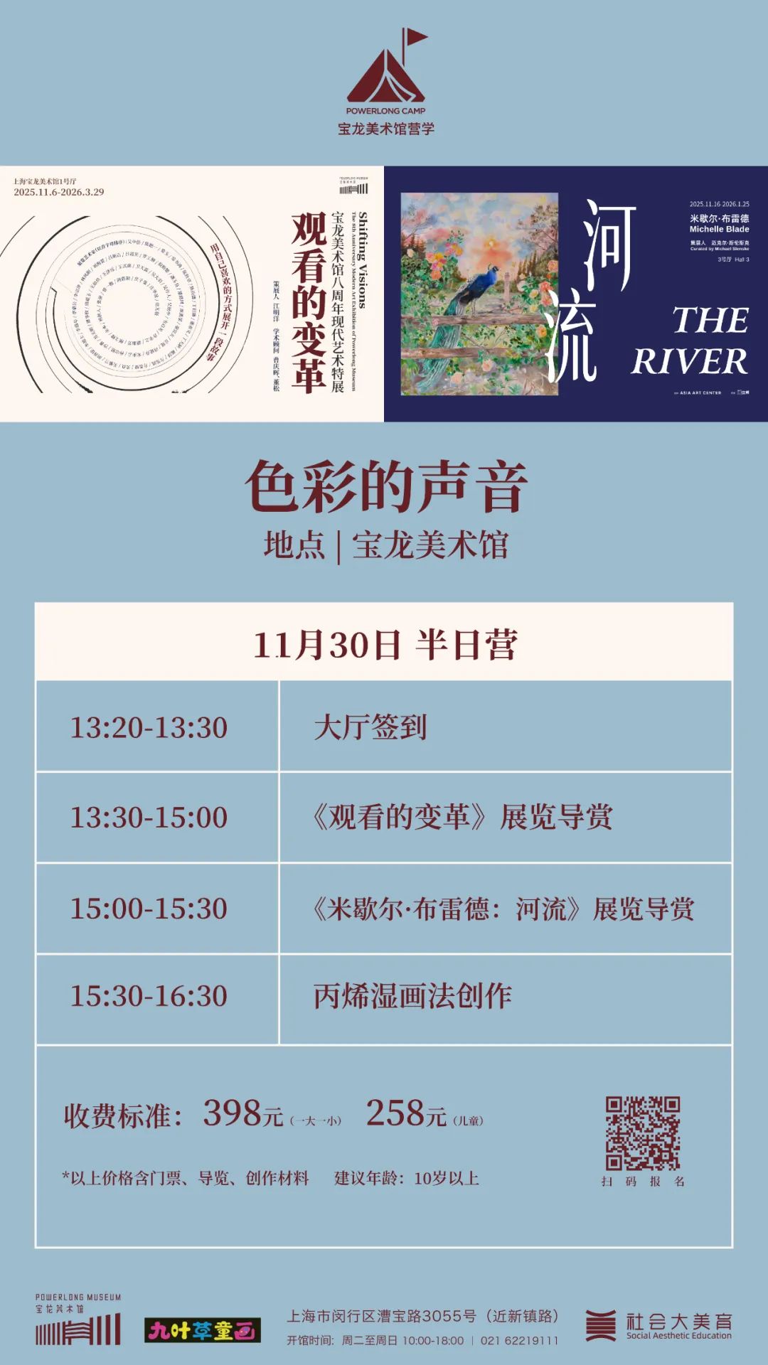 Powerlong Camp营学——色彩的声音,将带领孩子们开启一场奇妙的艺术之旅。不仅有专业的导师讲解《观看的变革:宝龙美术馆八周年现代艺术特展》和《米歇尔·布雷德:河流》两大展览,揭秘艺术家如何用色彩表达情感与时间,也将带领大家亲身体验神奇的“丙烯湿画法”工作坊,让色彩在笔下如水流般晕染、歌唱,真正听见色彩的声音。