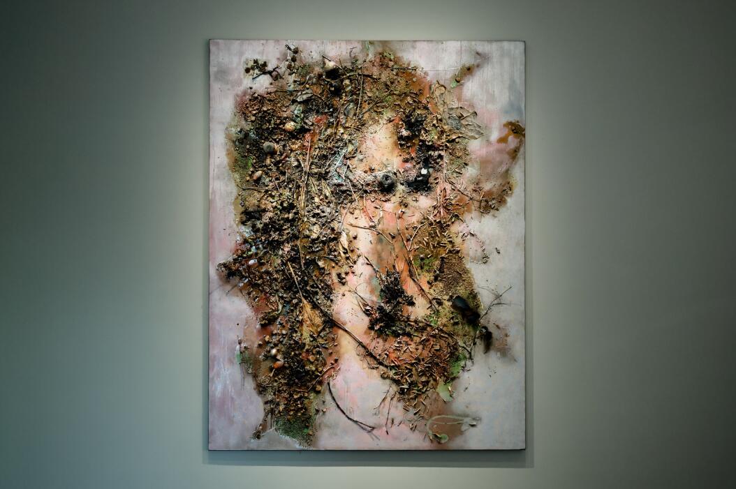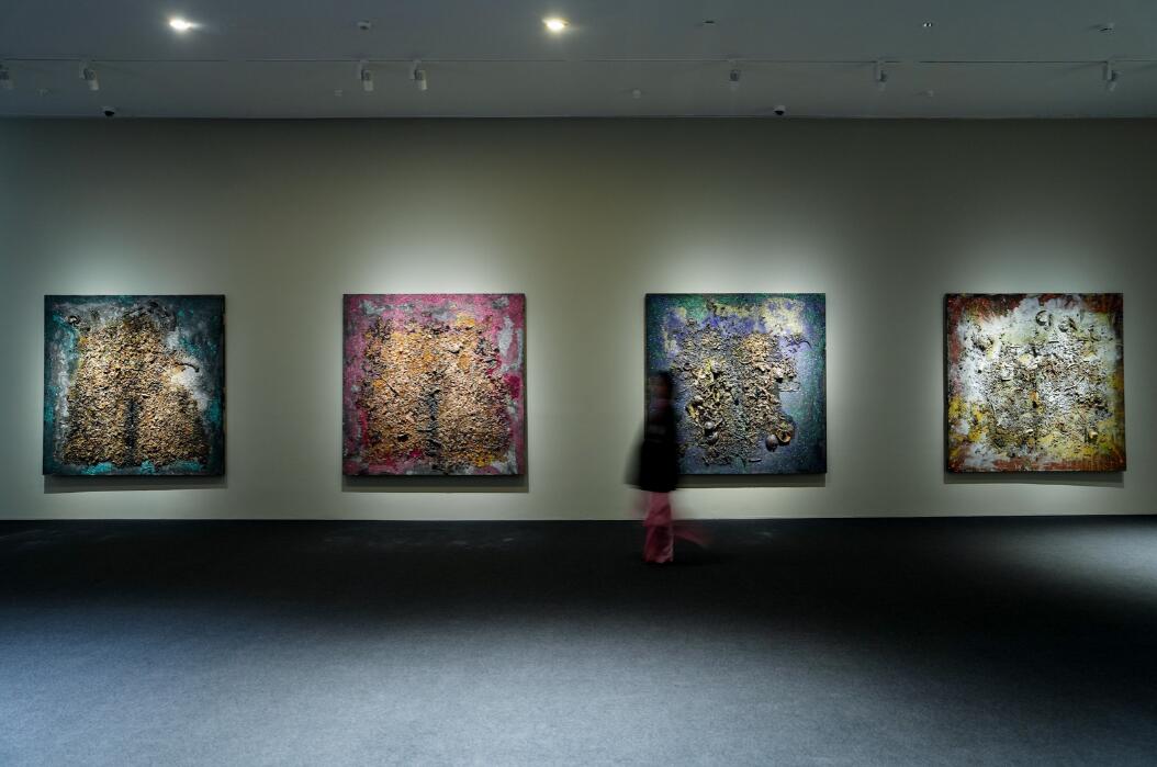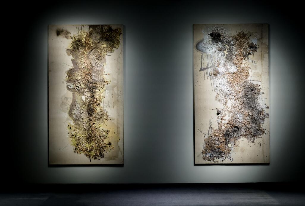 大憨的作品极具辨识度。他跳出传统绘画材料的桎梏,将中草药、佛教七宝、佛珠、茶叶等看似不相关的物品纳入创作视野,让每一种材料都在他的创作里释放独特的生命力。这些材料本身就带着强烈的个性,大憨在创作中不刻意改变本质,而是顺应材料的本性。同时,他对材料的运用、处理手段又增加了作品的不确定性与时间性。他的创作不追求刻意的完美,而是在自然随性中体现修行修心。一笔一画皆随心意,一涂一抹尽是禅机。他的作品保留创作的痕迹,这种痕迹是他对话自我、对话自然、对话佛法留下的痕迹。“万物同源”,在不确定中寻找平衡,在偶然中获得必然。如晚烟般轻柔,却能穿透人心。