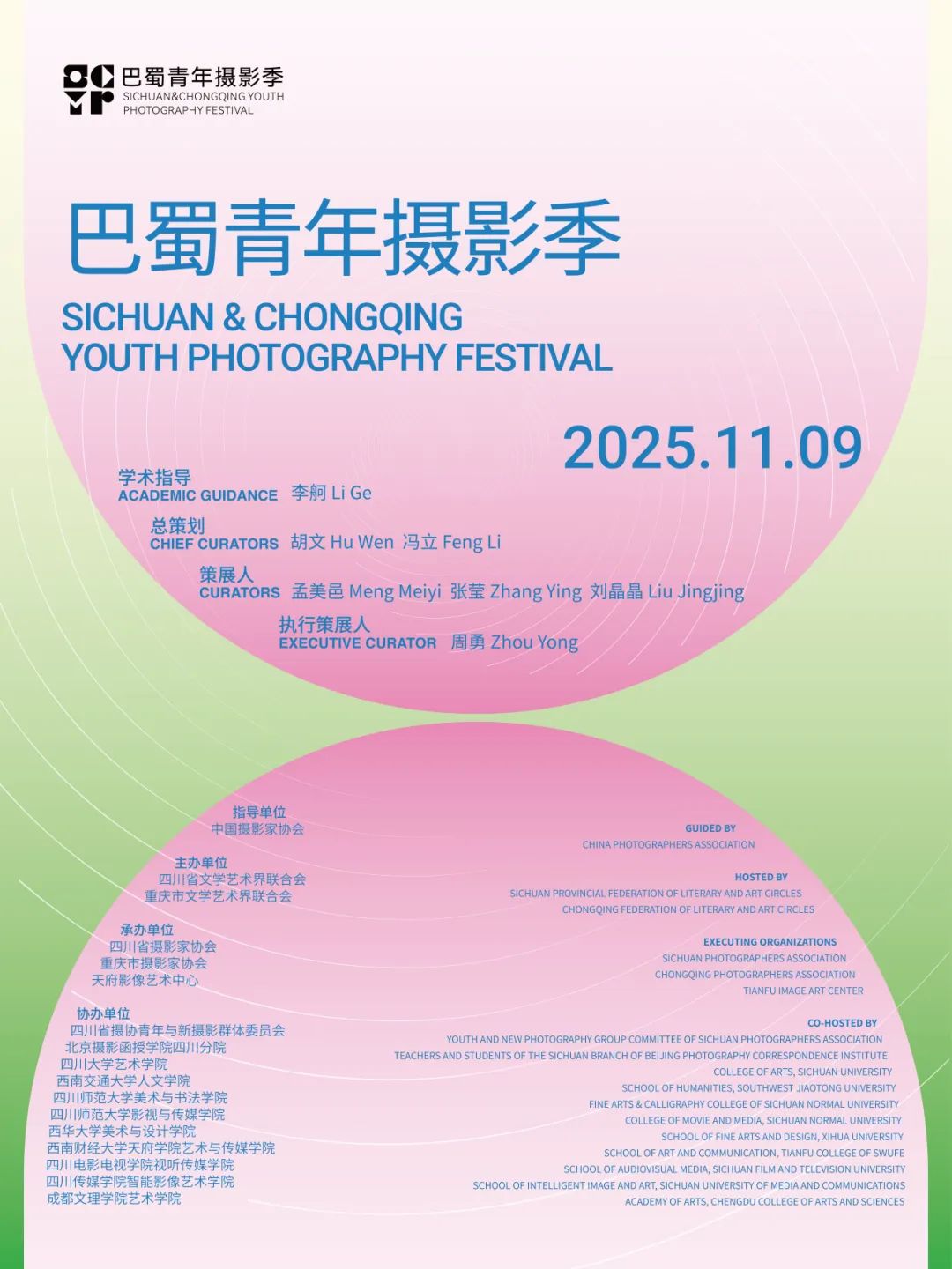 2025巴蜀青年摄影季共推出六大影展:《变:第六届巴蜀青年摄影作品展》《年轻的朋友来相会:中法摄影作品展》《智摄无界,光影铸魂:0与1的影像图腾数字摄影展》《像素之外:首届北京摄影函授学院四川分院师生摄影联展》《桃李芬芳——四川省高校师生摄影作品联展》《四川省2025年新人新作摄影展》。