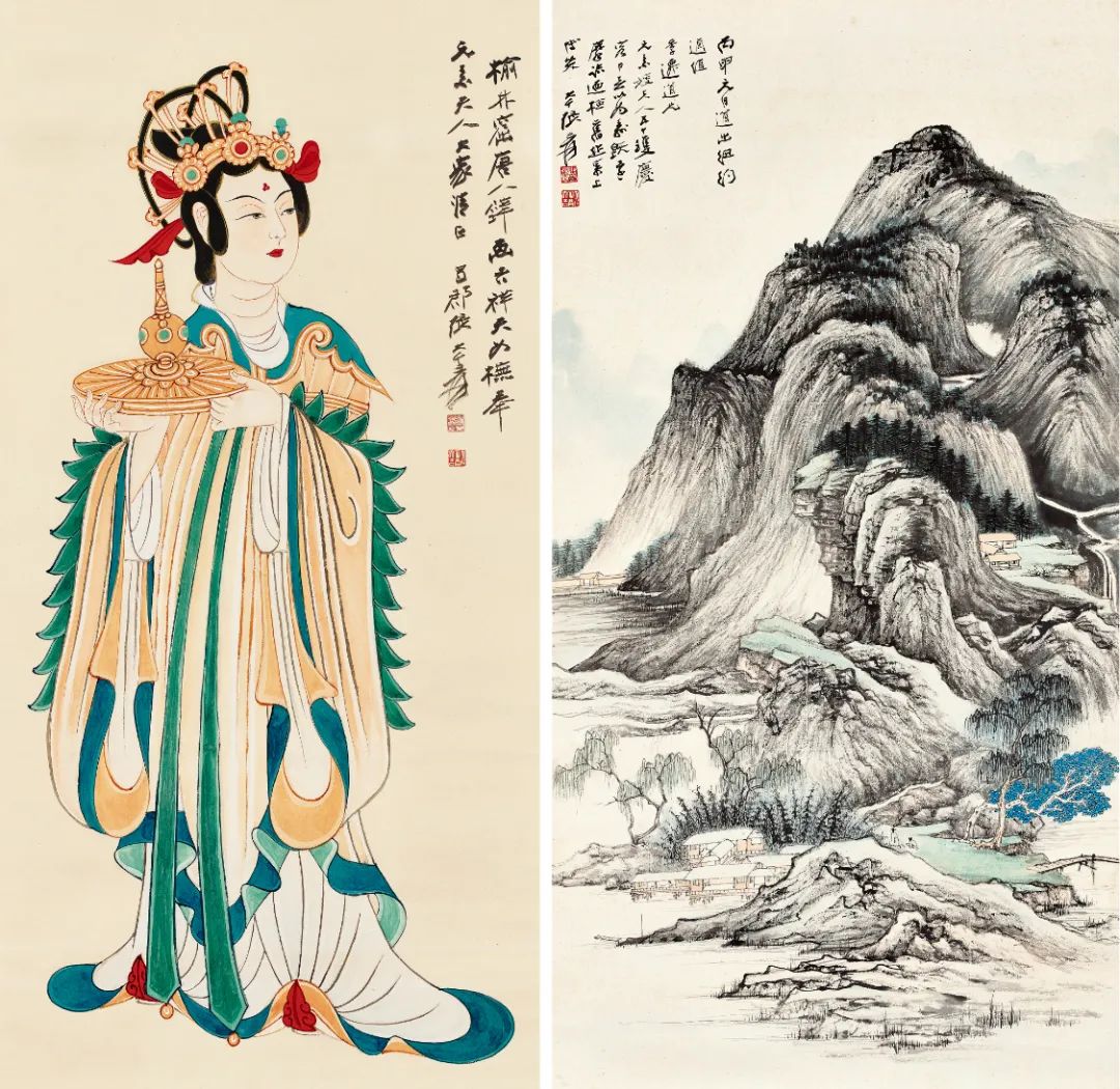 张大千两件杰作表现稳健。展现其盛年"血战古人"功力的《仿王右丞江山雪霁图》以770.5万元成交,《致王季迁伉俪玉女进酒图、仿曹知白山水》以667万元易主。