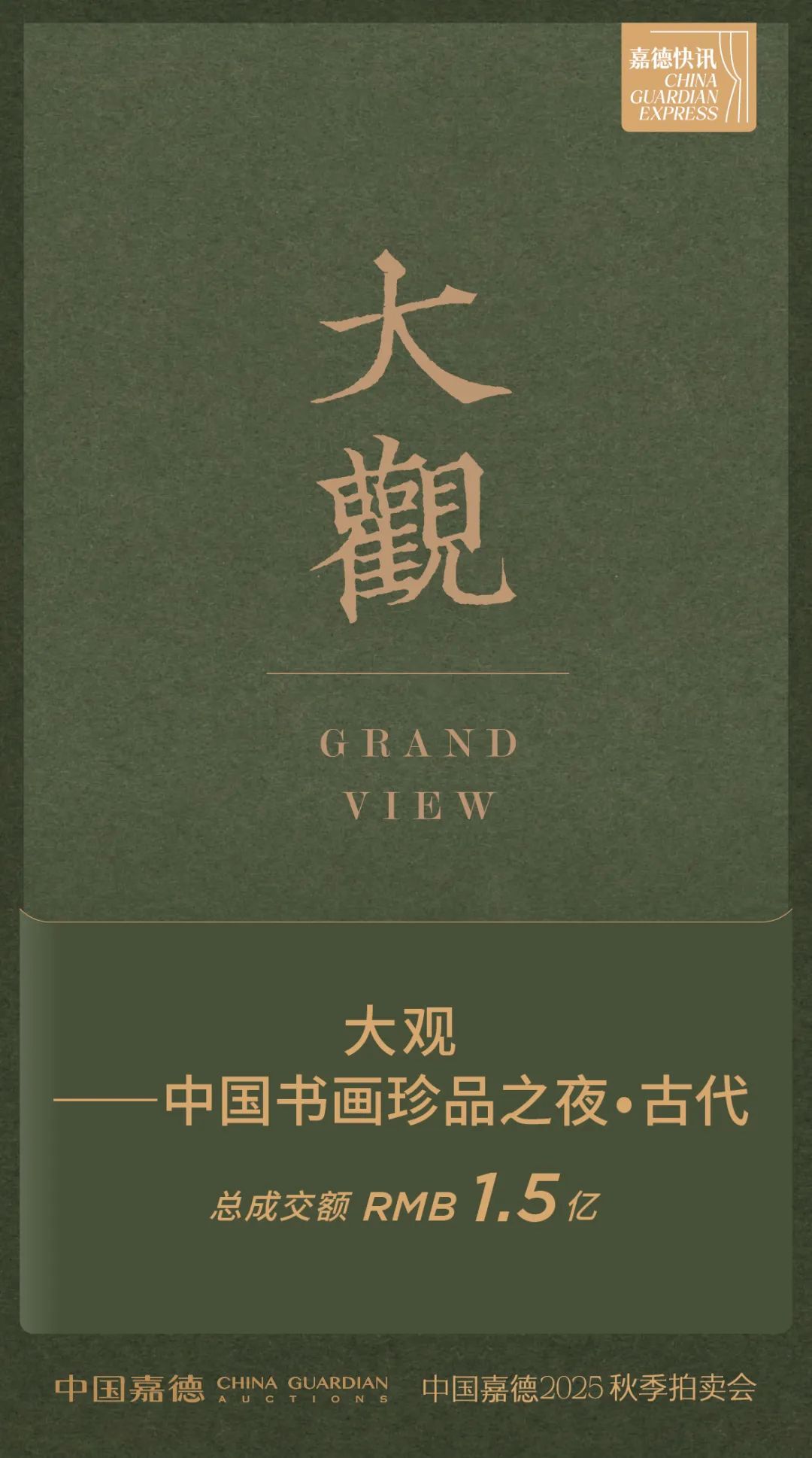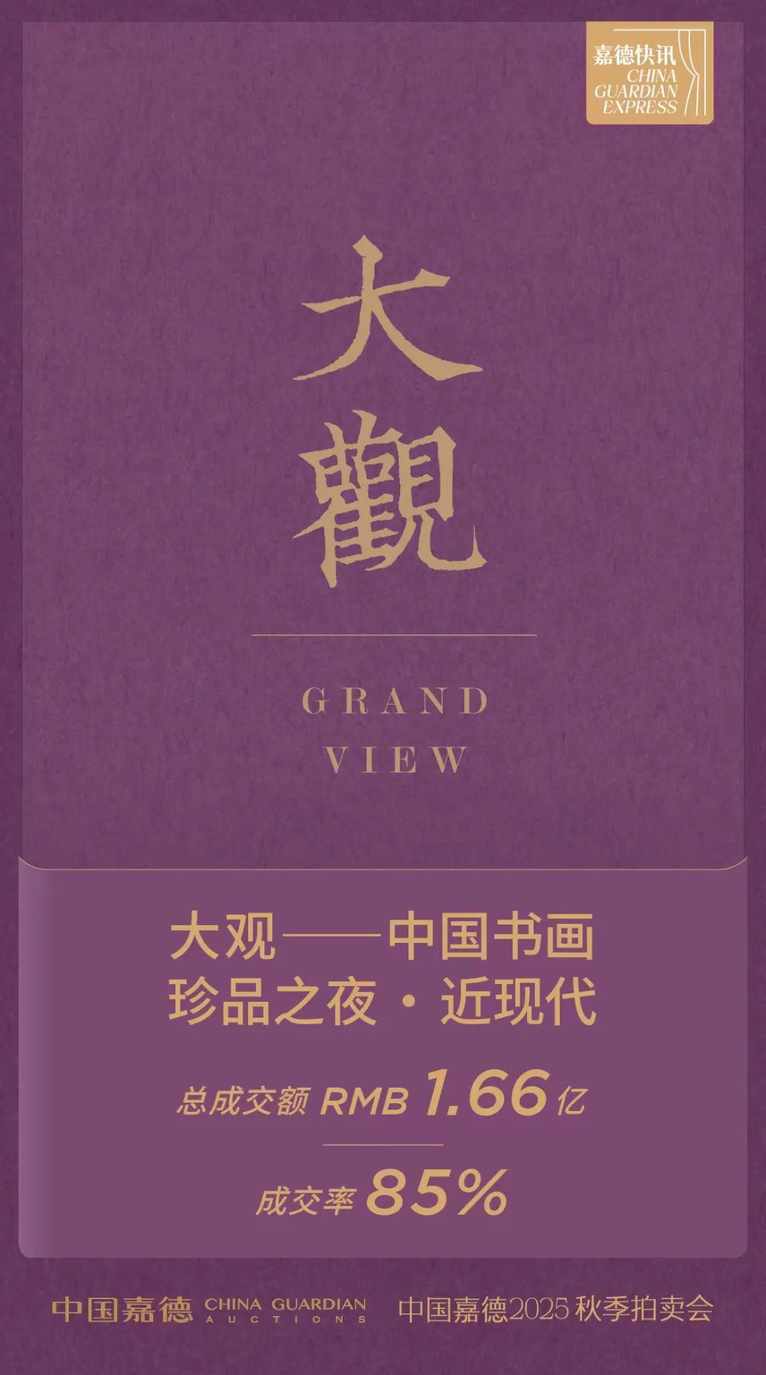 "大观——中国书画珍品之夜·近现代"专场于11月24日16:30举槌,是这一具有风向标意义的品牌专场自2011年创立以来的第三十季。本场65件作品总成交额达1.66亿元,成交率85%,在数量精简、估价务实的策略下,展现出市场对精品书画的稳健需求。
