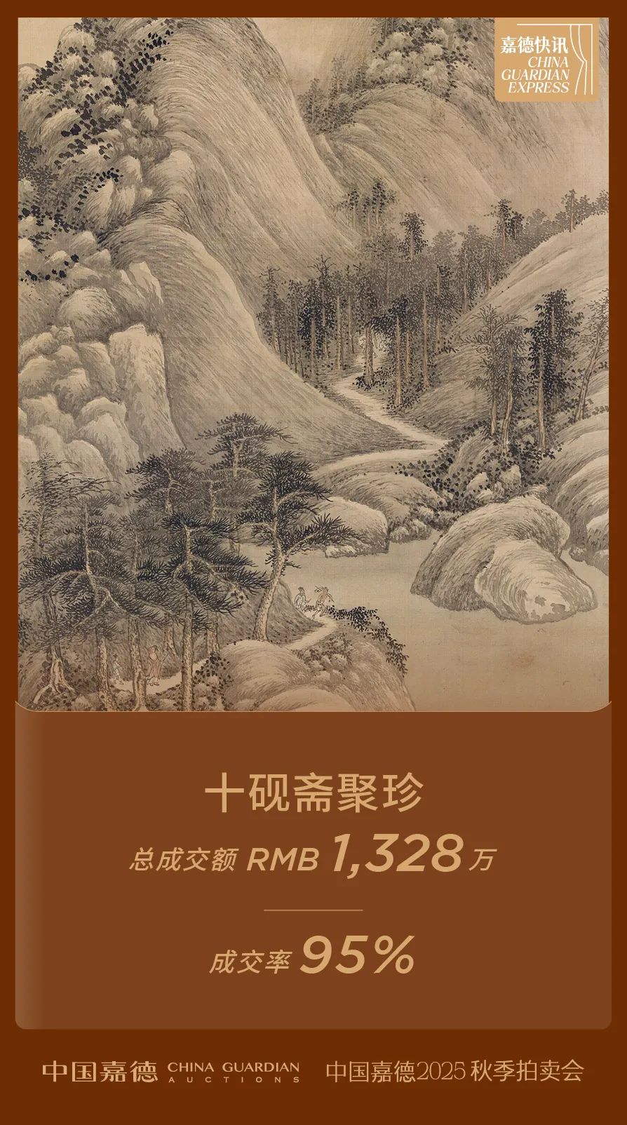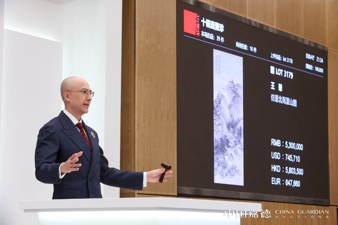 “十砚斋聚珍”专场是“十砚斋”主人与嘉德第三次携手推出的专场拍卖。全场39件古代书画佳构经过激烈竞投,最终取得总成交额1328万元、成交率95%的亮眼成绩,延续了“十砚斋”的拍卖佳话。