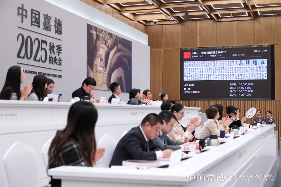11月24日晚10时,"大观——中国书画珍品之夜·古代"专场在热烈氛围中举槌。尽管夜已深沉,拍卖大厅内藏家竞投热情依然不减。本场呈现的38件明清书画精品力作,最终取得总成交额1.5亿元,五件拍品成交价超过千万元的稳健成绩。明内阁首辅夏言《行书仙坛雅集诗》以4025万元的成交价领衔,刷新夏言作品拍卖成交价纪录。多个拍品远超估价成交,显示出古代书画市场的深厚底蕴与持续活力。