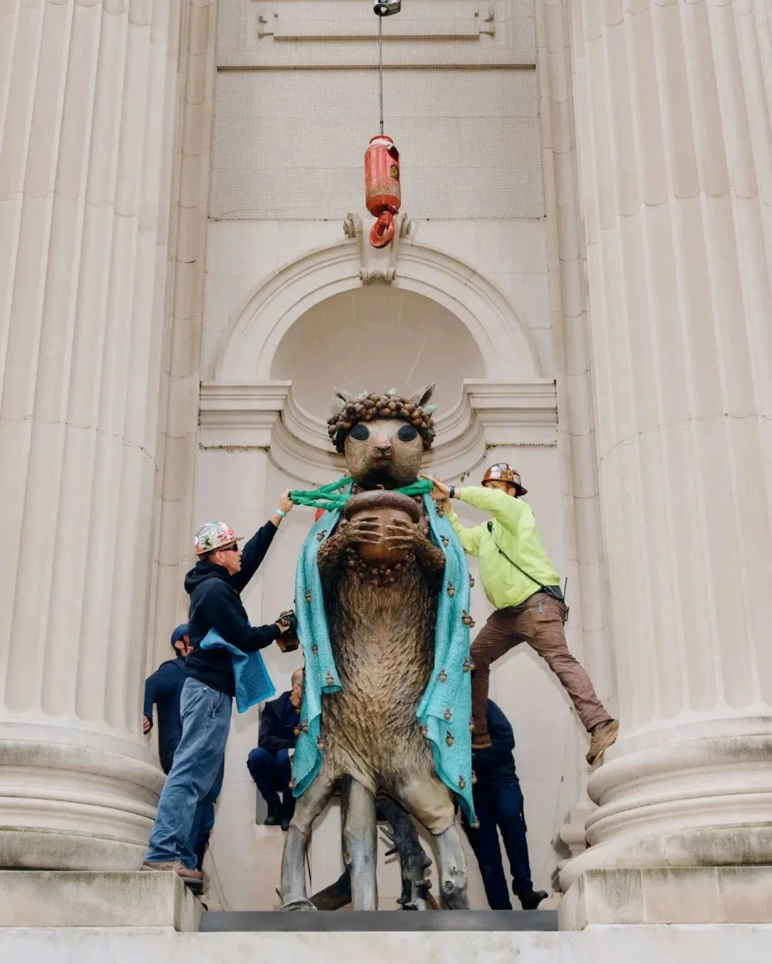 自今年9月起,吉布森再获重要委托,成为纽约大都会艺术博物馆外墙户外艺术项目的第六位受邀艺术家。这一系列名为《动物,故我在》的四件青铜雕塑,分别以鹰、松鼠、郊狼与鹿这些纽约地区常见的动物为形象,也是吉布森首次以纪念碑尺度深入探索青铜材质。雕塑表面饰有复杂而大胆的铜绿抽象纹样,灵感源自原住民传统中的串珠与织物图案,并将其无缝融入形体结构之中,展现出文化符号与雕塑语言的有机融合。该系列将持续展出至2026年6月。