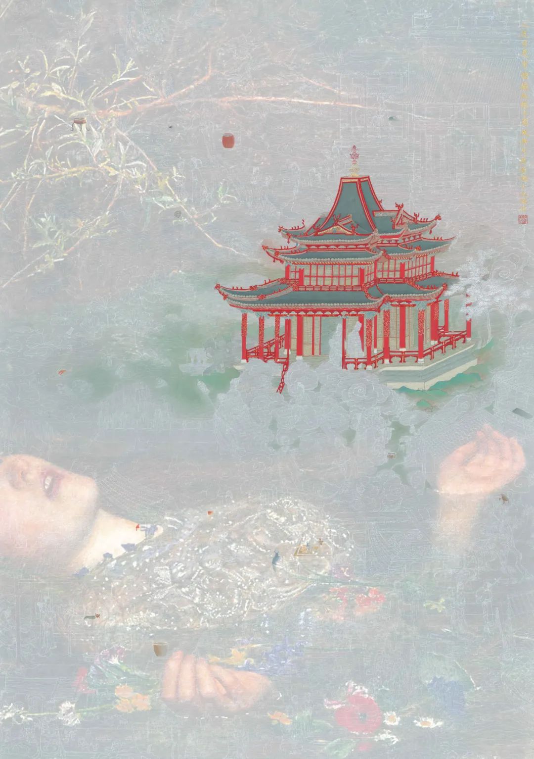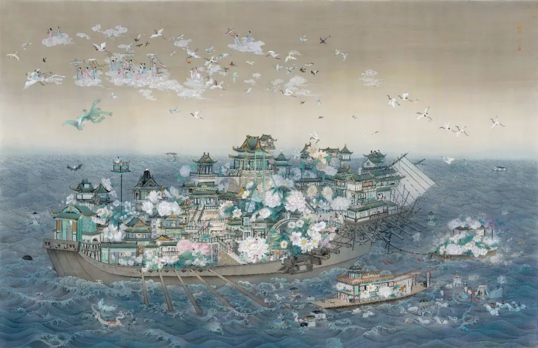 孙欣主任编辑认为,王依雅的创作在当代新工笔绘画的脉络中延伸,卓有成就。首先是“以幻为真”。王依雅将花这一显性符号放大,硕大的花簇使殿宇成为画面的点缀,打破了既有的图像结构,强化了图像的观念性。女性的失语和自由,核心是其情感和观念的深入觉醒。其次是“以实映虚”。王依雅经历了严格的学院训练,皇后冠作品面孔的留白,成为情感流动的切口。华冠实、面孔虚,仙船的烟波,使空幻成为无常的隐喻。最后是“以繁归简”。王依雅用繁复回应传统的极简,文人画简中见逸,而王依雅是繁中见简,用“极多”引人深思。尤其是《上元》中的生命倏忽之感,让人有格物致知的深思和共鸣。