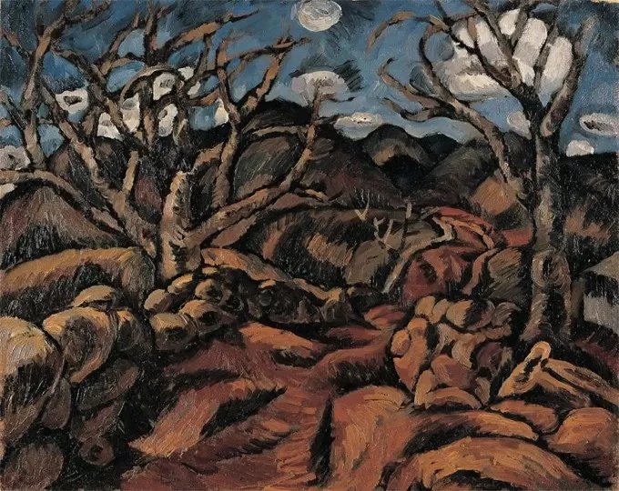 他笔下的圭山,彻底蜕变了。红土仿佛在燃烧,树木扭曲着向上生长,人物与土地浑然一体,这一切,都已不是风景,而是内在生命焦虑与渴望的直接投射,也是他倡导的“新具象”——心灵的具象,灵魂的具象——最为直接的体现。吕澎曾精准地写道:那田园诗般的圭山,并不属于艺术家,它只是这一代人聊以自慰的临时疗养所。当艺术家回到冷冰冰的水泥房间,当他通过窗户“看路灯、看行人、看夜路”的时候,虚幻的田园诗意便荡然无存。