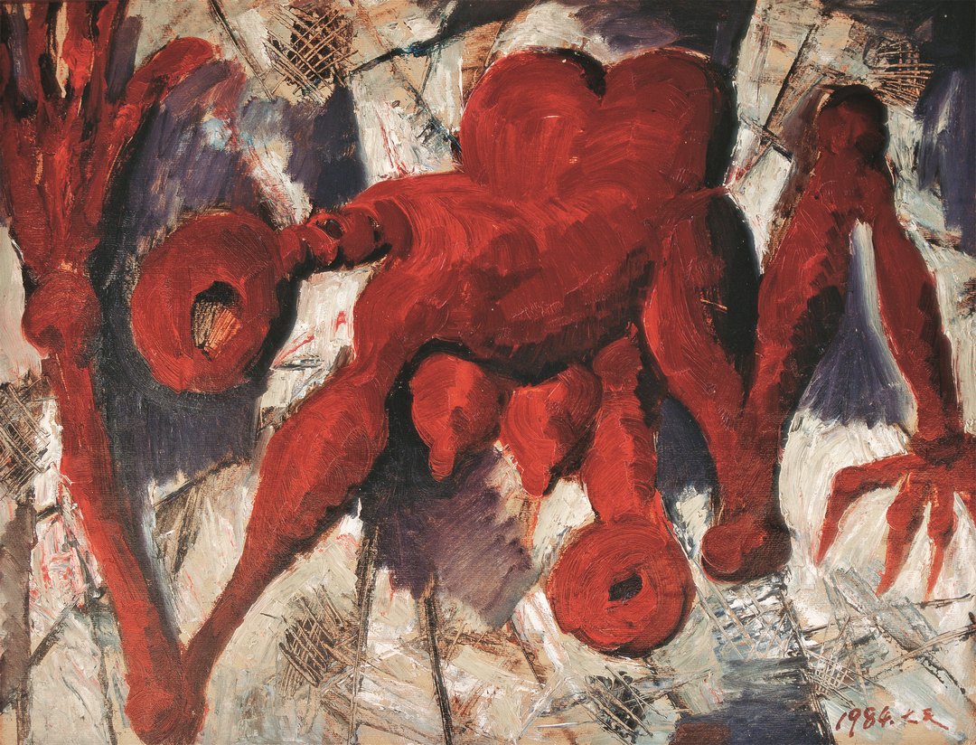 圭山成为毛旭辉磨练绘画语言的工具,对“风情”的猎奇被纯粹的语言探索所替代。这也直接锻造了他充满张力的表现主义语言。1980年代的《红色体积》系列,如岩浆般迸发出来,形体在画面上膨胀、挤压、呐喊。对此,毛旭辉有自己的诠释:“在所有一切伟大的艺术里,我们看到的是灵魂那些感人的言词……那些浮动在事物背后的幽灵。”绘画于他,从来不是形式的游戏,而是捕捉灵魂“幽灵”的冒险。
