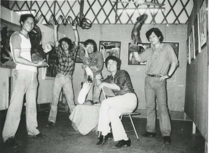 1985年6月, 首届“新具像画展”在上海静安区文化馆举办,参展艺术家展场留影 左起依次为:毛旭辉、潘德海、张隆、徐侃、刘铁君