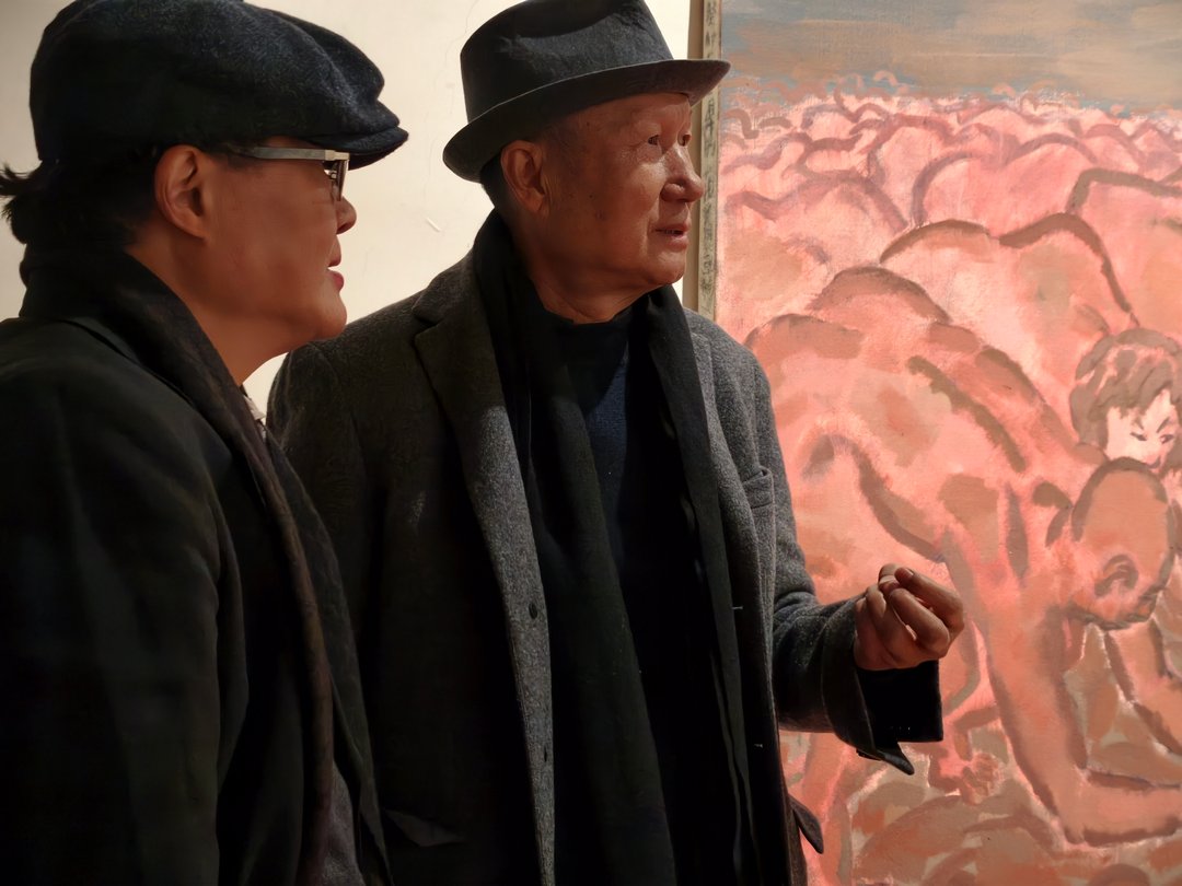 吕澎与毛旭辉在展览“毛旭辉:家长的故事”开幕现场