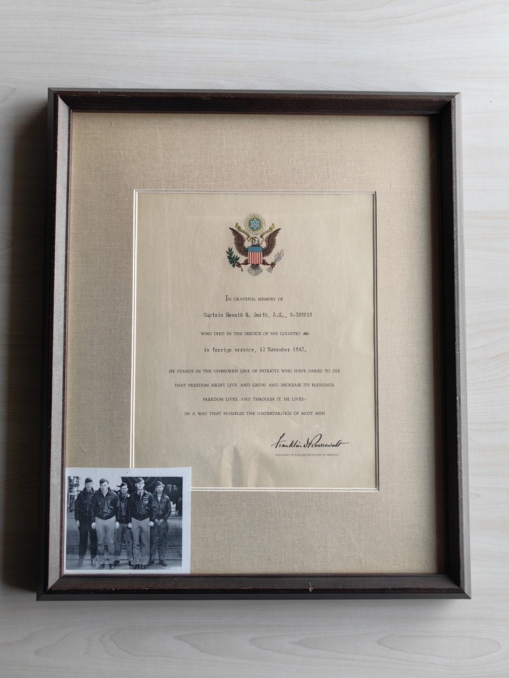 二战时期的美国总统罗斯福签署的纪念文件,以缅怀史密斯上尉在海外服役期间为国捐躯的英勇事迹