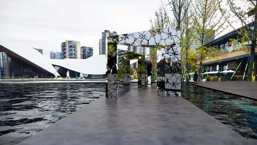 落笔是科技、自然与水的共生。随着视线向湖区延伸,作品开始变得轻盈灵动。这里有JUJUWANG的《眺望者的花屿》,用镜面不锈钢镂刻出通透的芙蓉花;有郑路的《淋漓》,将坚硬金属幻化为凝固的飞溅水花;还有邓乐的《一路风景·天府》,这组动态雕塑如同城市的眼睛,在旋转折射中将天府之国的湖光山色收纳其中。