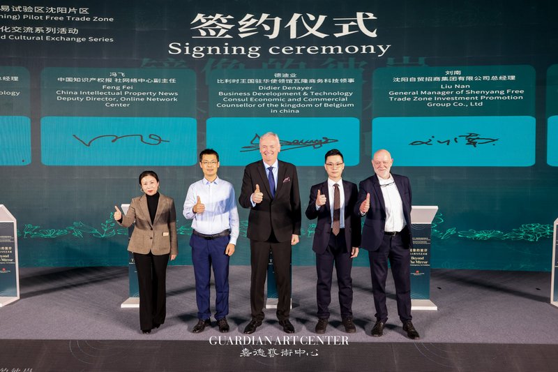 (左起:辽宁易境智链科技有限公司副总经理刘一鹏,中国知识产权报、社网络中心副主任冯飞,比利时王国驻华使领馆瓦隆商务科技领事德迪业,沈阳自贸招商集团有限公司刘南,比利时列日皇家美术院院长丹尼埃尔·斯吕思)