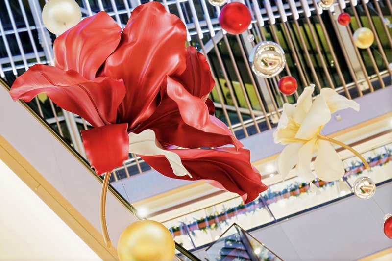 《对话/Dialogue》艺术装置位于兴业太古汇LG1中厅,两座取材自上海及巴黎地标建筑的光影装置彼此对望,装置之上,东方玉兰与法式鸢尾两种花卉吊坠其间,呼应中法文化“以简驭繁”的美学哲思,在充满祝福的节日季中,营造出跨越地域、语言与文化的诗意氛围。花卉由具备中法创作背景的艺术家蔡雅玲以玻璃等综合媒材创造,柔韧轻盈的花卉,与塔形构架的金属材质之间形成张力。塔象征着稳固的文化框架与历史叙事,而双城市花则代表了流动与再造的文化活力,绚丽光影跃动之间,巴黎巴洛克宫廷的华丽与上海海派都会的摩登并置,完成一场跨洋双城记的文化叙事。