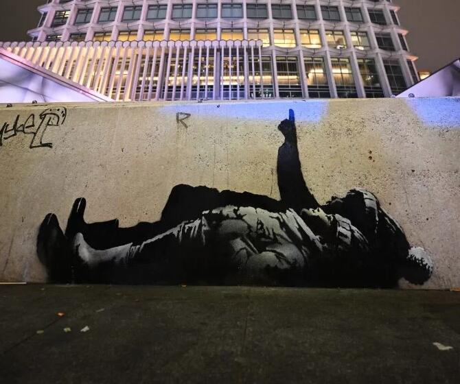 上周五,伦敦市中心中心点大厦外出现了一幅完全相同的图像。人们普遍认为这是班克斯的作品,但这位艺术家尚未正式认领这幅作品。