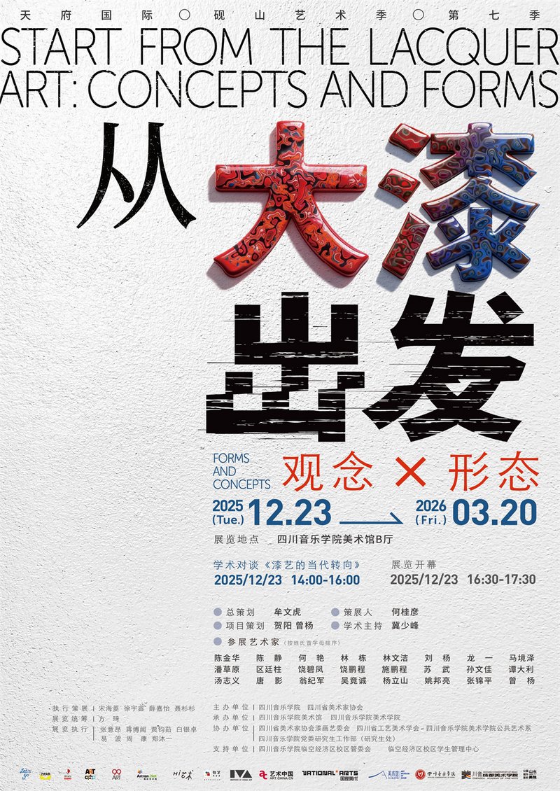 2025年12月23日,天府国际·砚山艺术季第七季“从大漆出发:观念与形态”展览在四川音乐学院美术馆B厅隆重开幕。本次展览由四川音乐学院、四川省美术家协会主办,四川音乐学院美术馆、四川音乐学院美术学院承办,并得到了四川省美术家协会漆画艺委会、四川省工艺美术学会、四川音乐学院党委研究生工作部、四川音乐学院美术学院公共艺术系的协办支持。