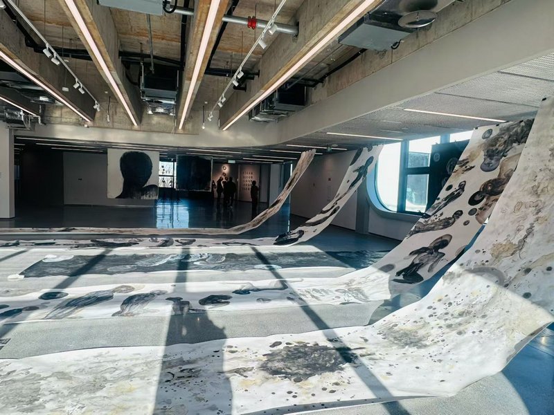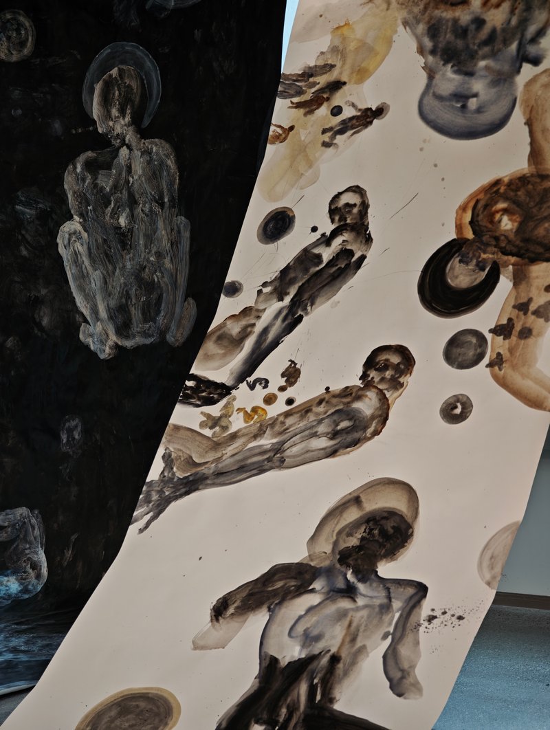 “希望曾经不存在”与“寂静的悲鸣”两个系列在展厅中紧密相连,形成可资对观的内在关联。无论是疫情创伤,还是“象王”遭盗猎的生态悲剧,胡行易都未停留于具象记录,而是从中抽离出悲悯、无助、荒诞、呐喊等本质情绪,并将其塑造成抵抗遗忘的视觉纪念碑。英国画家卢西安·弗洛伊德(Lucian Freud)曾言:“我对看起来像照片的画不感兴趣,我希望油画的感觉像肉的质感。”在胡行易近于表现主义的绘画中,人体早已超越再现和质感,成为了承载其对人类未来忧思的媒介。存在主义式的绝望与反抗,置于技术资本的当代语境下,使得个体身份与人类前途愈加扑朔迷离;同时,疫情与捕猎事件亦严峻地揭示了人与非人、人与多物种关系的伦理困境。在“寂静的悲鸣”中,胡行易挪用宋画“模山范水”的水墨形式,这一常遭现代批判的传统程式,在此刻获得了全新的表现力与感染力,因其承载了象王无声的哀鸣与艺术家悲怆的祈祷。