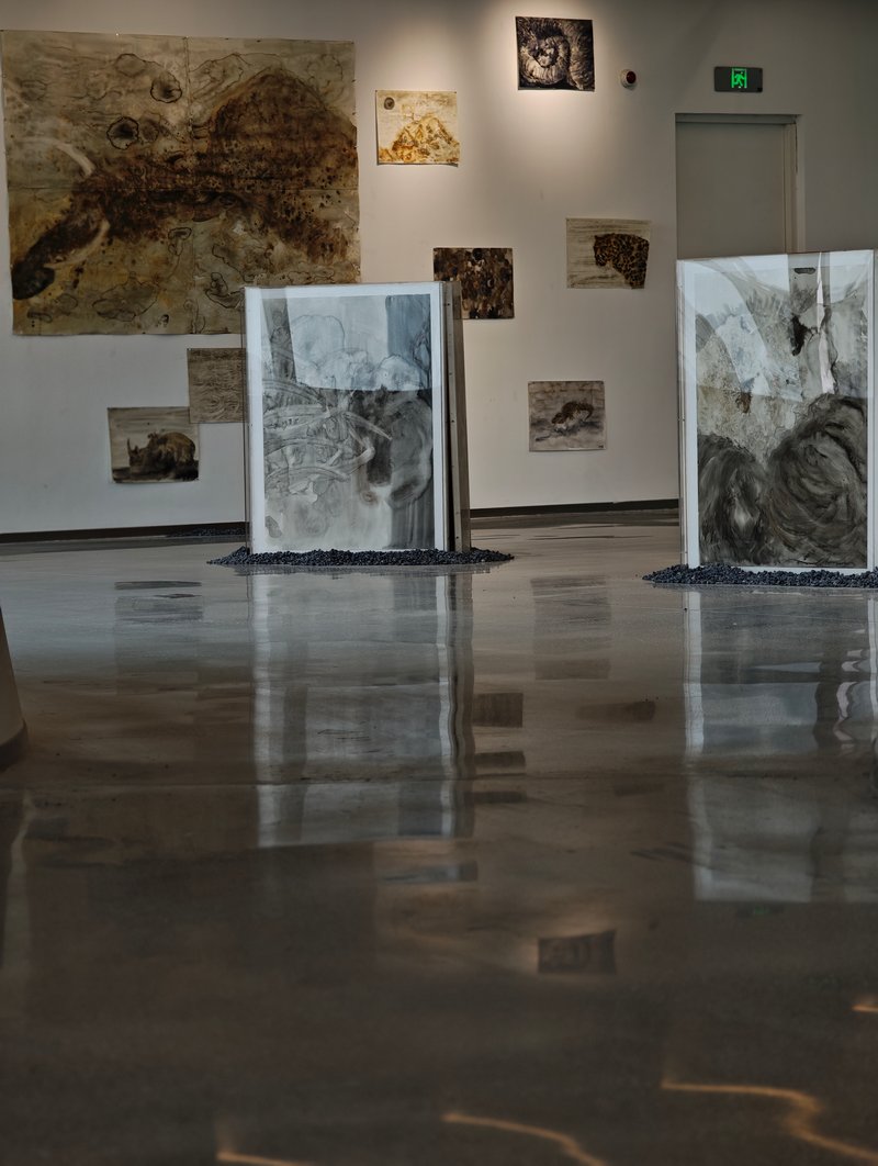 蜂巢二楼的第一展厅,“无垠降临”系列直面这一命题。电影《降临》中外星生物的意象给予胡行易灵感,但他并非简单再现,而是借此想象一种作为外太空“传教士”的宇宙孤寂。胡行易早年热衷雕塑,尽管该系列采用纸本综合材料,但画面中“类人”(Humanoid)形体的塑造充满体量感与空间张力。这些形体处于失重悬浮状态,或可视其为现代技术将人“连根拔起”后,“被抛于世”的存在写照。然而,胡行易并非彻底的技术悲观主义者;在“无垠降临”系列看似冰冷的金属质感表皮之下,涌动着一股深沉而略带忧伤的宇宙浪漫理想。尽管对可能“被降临”的人类未来充满迷惘,他仍试图以西西弗斯式的冲动,为生命在无限时空中勾勒幸存坐标与可能意义。