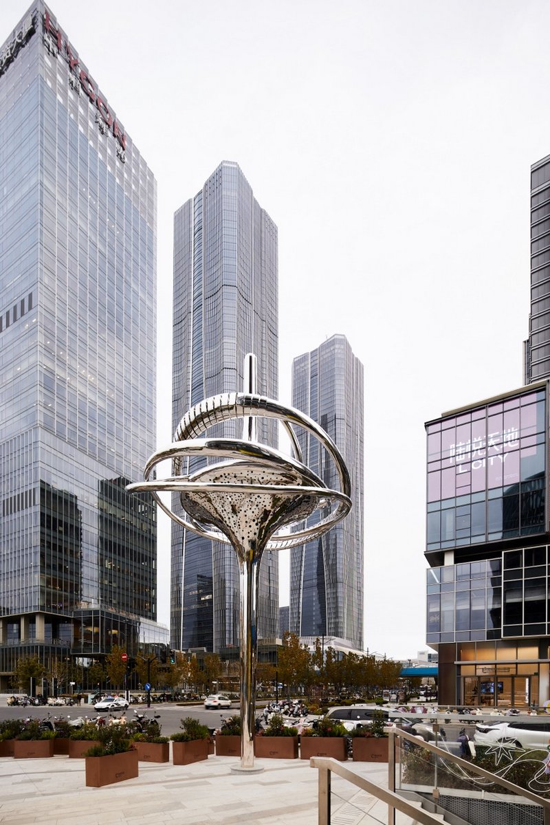 在陆悦天地的入口处,艺术家王光旺的大型装置作品《时光之迹》亭亭而立。这枚优雅的陀螺天体,仿佛时间之轮缓缓展开,其表面映照出周围的景物,又在反射的时空中将其汇聚。