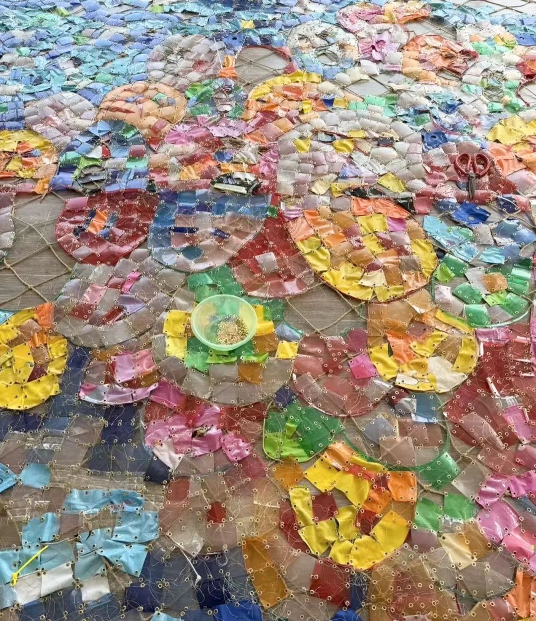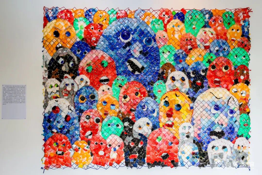 回到这件装置本身,当观者的目光首先闯入这件“综合材料”的场域时,其创作逻辑是清晰可辨的:艺术家将沙滩上捡拾而来的废弃物进行切割、重组,镶嵌于网格状基底之上,形成近百张表情各异的“光头”面容。它们密集、饱满,却各自孤立;鲜艳、夺目,却本质残破。近看,这些碎片脱胎于塑料瓶罐、织物残片与金属丝线等消费产物,它们未经刻意美化,保留着被海水反复吞吐、日晒风化后褪而未尽的色彩和粗糙质感,带着清晰而刻意的消费社会产物痕迹。