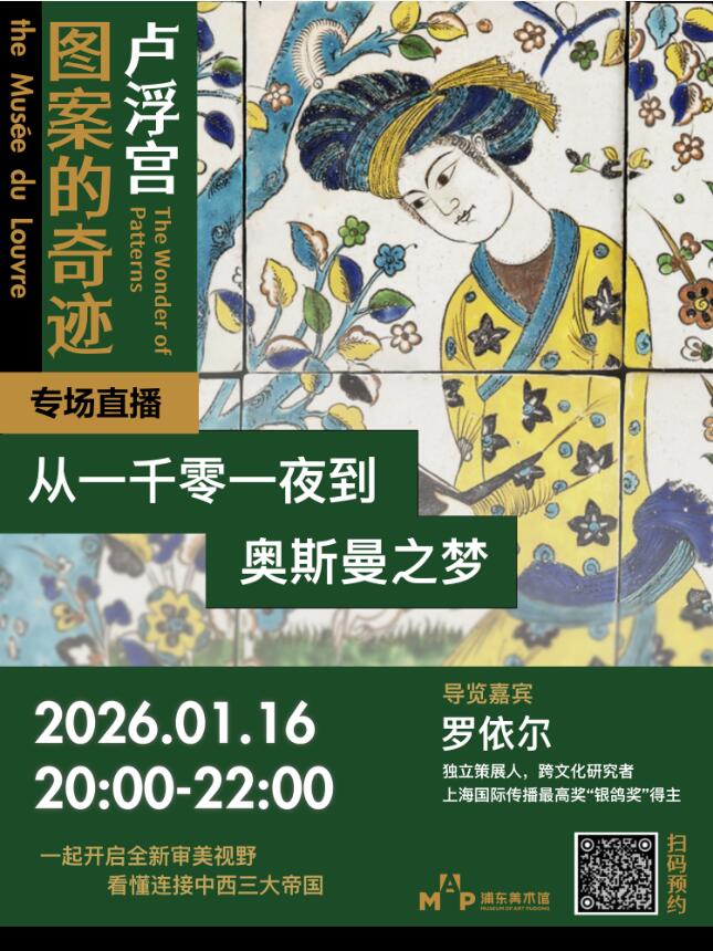浦东美术馆特别邀请到独立策展人、跨文化研究者、上海“银鸽奖”得主罗依尔为观众带来“图案的奇迹”主题直播——“从一千零一夜到奥斯曼之梦”。300件卢浮宫馆藏珍品跨越时间与距离,为观众开启一段视觉与思想之旅。
