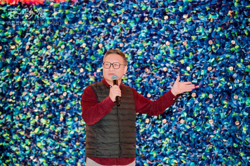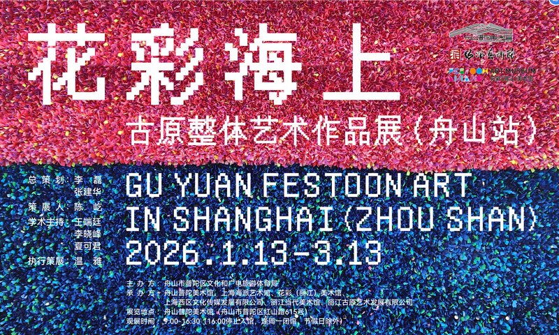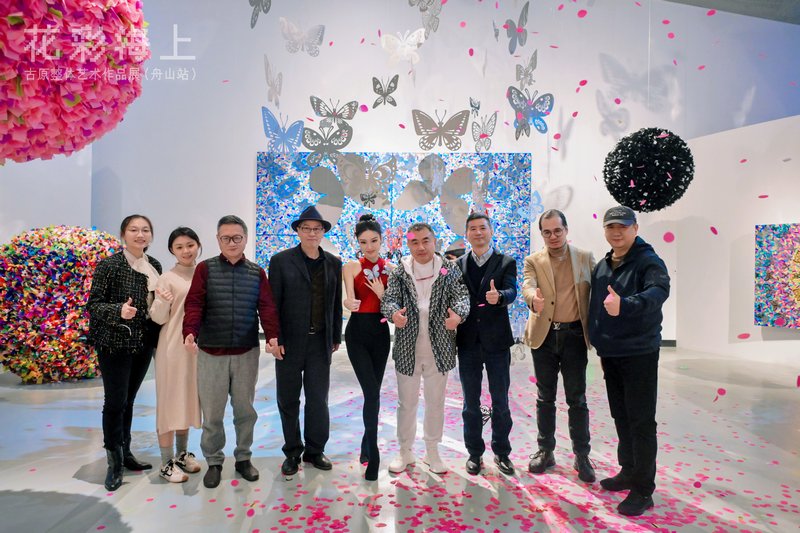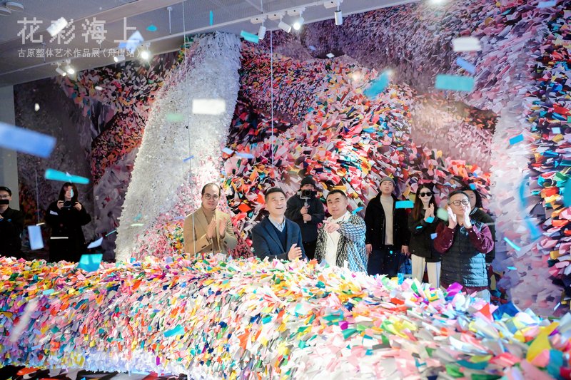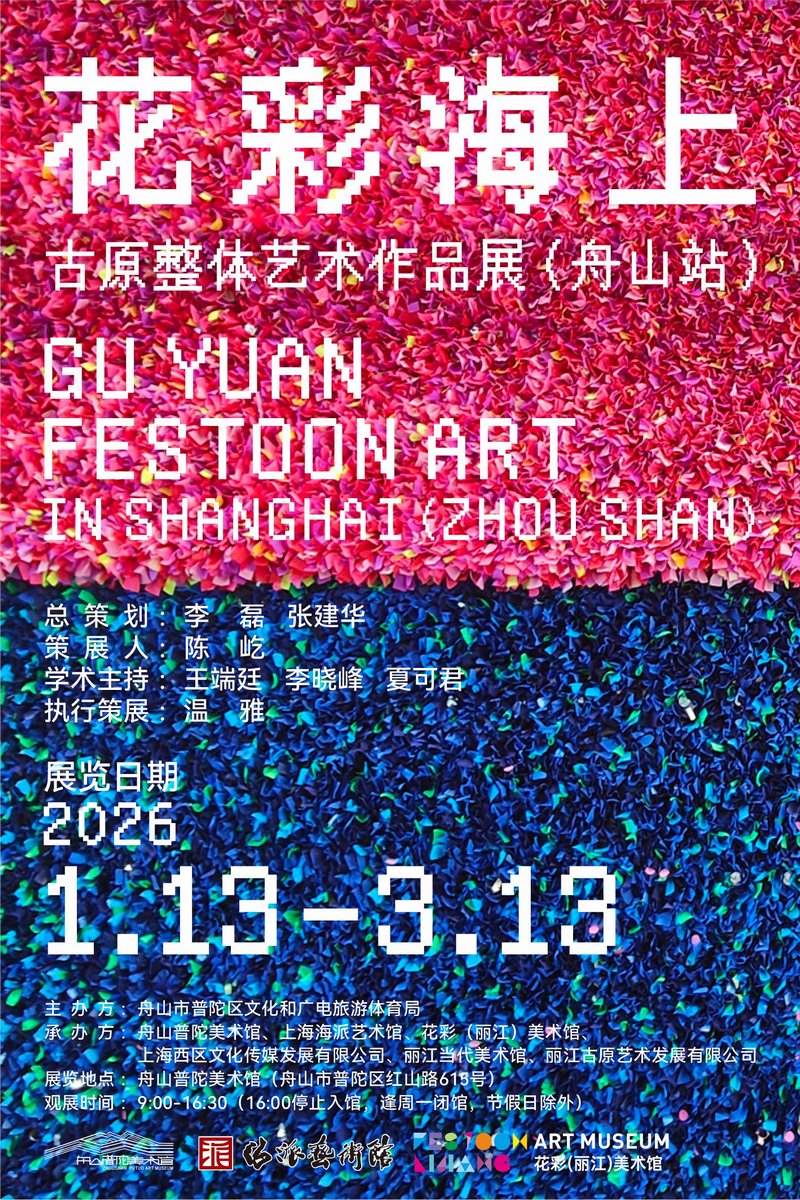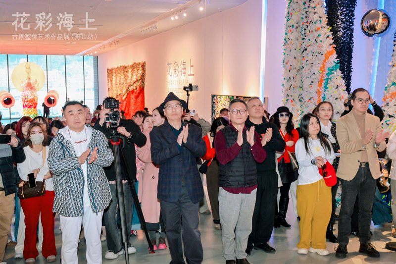 2026年1月16日,“花彩海上——古原整体艺术作品展”在舟山普陀美术馆华彩启幕。本次展览集中呈现了艺术家古原旅居丽江期间创作的近百件作品,是在其“花彩海上”上海站展览的基础上全新策划而成,涵盖装置、架上绘画、雕塑、影像等多元媒介。全面呈现了他以“花彩艺术(FESTOON ART)”为核心的艺术探索与当代转化实践,充分展示了融合多元媒介的“文化观念主义艺术”。