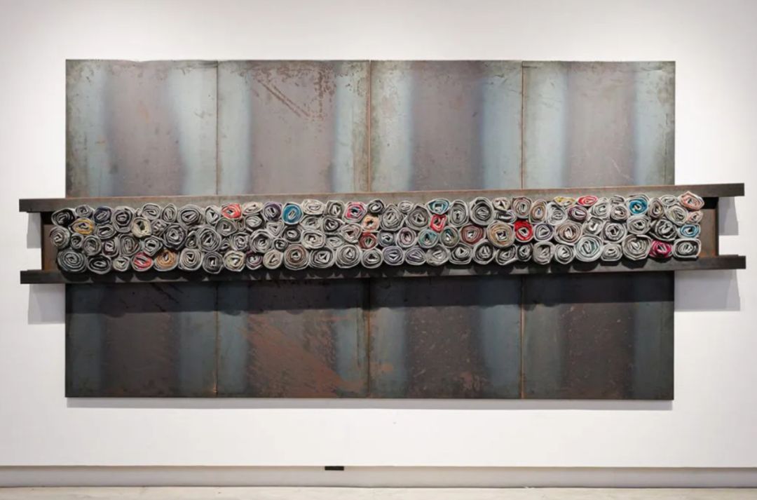 著名意大利“贫穷艺术”代表雅尼斯·库奈里斯被视为与约瑟夫·博依斯同代的大师级人物,也是参展卡塞尔文献展与威尼斯双年展次数最多的艺术家之一。在他的作品《无题》中,厚重的深色铁板嵌入了卷起的二手衣物,它唤起人们对二十世纪六、七十年代意大利工业景观的记忆,将一段集体性的生产历史转化为沉静而富有诗意的物质在场。