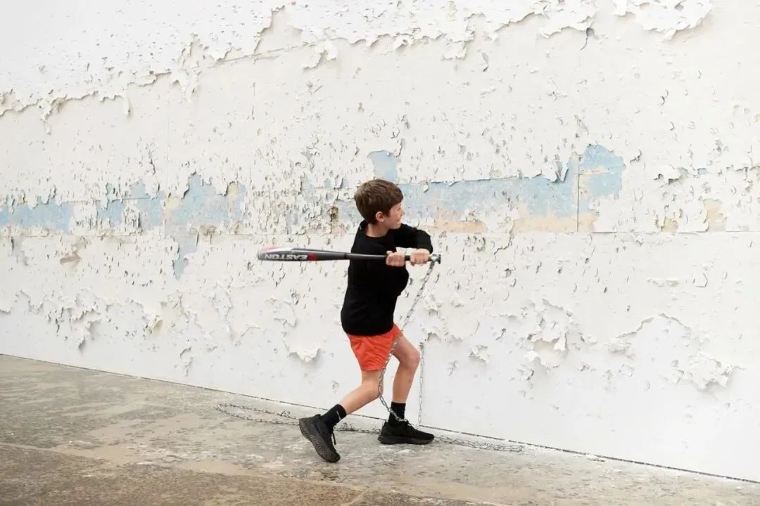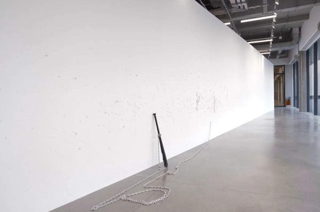澳大利亚艺术家马科·富西纳托的《星座》邀请观众成为其共同创作者。一根黑色棒球棒被锁链锁在一面大型水平白墙上,当参观者敲击墙面时,隐藏在墙体背后的扬声器会即时放大并转译这些敲击声,随着时间推移,积累出一系列击痕形成星形图案。该作品曾于2018年悉尼双年展展出,以极简的互动形式探索了暴力、声音与公共参与之间的复杂关系。