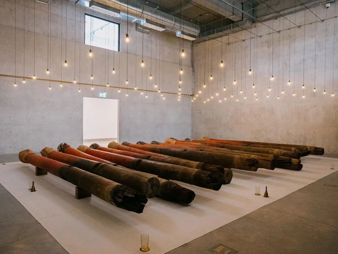霍姆廷通的装置作品由14根装饰华美的佛教寺庙立柱构成。这些柱子从泰国北部回收而来,被横向置于昏暗的展厅中,如同被放大的神圣火柴。艺术家在创作前仔细清洗了每一根柱子,并以布包裹,其过程宛如对待逝去亲人的遗骸。通过这种仪式化的处理,传统建筑构件被转化为承载着记忆、信仰与文化消逝的静默之物,在水平状态中引发关于传承、变迁与重生的冥思。