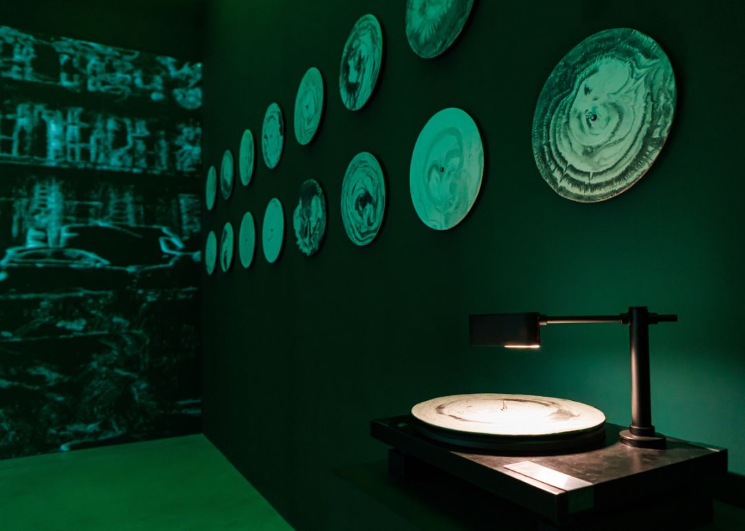 艺术家在2023年整个夏季,坚持每日于黑胶唱片表面进行绘画。在装置中,这些被绘制的唱片并非通过传统唱针播放,而是由摄像传感器“读取” 盘面上的视觉图案,进而将图像数据转化为算法驱动的电子音景。作品以诗意而技术化的方式,重新诠释了记录、时间与媒体物质性之间的关系。