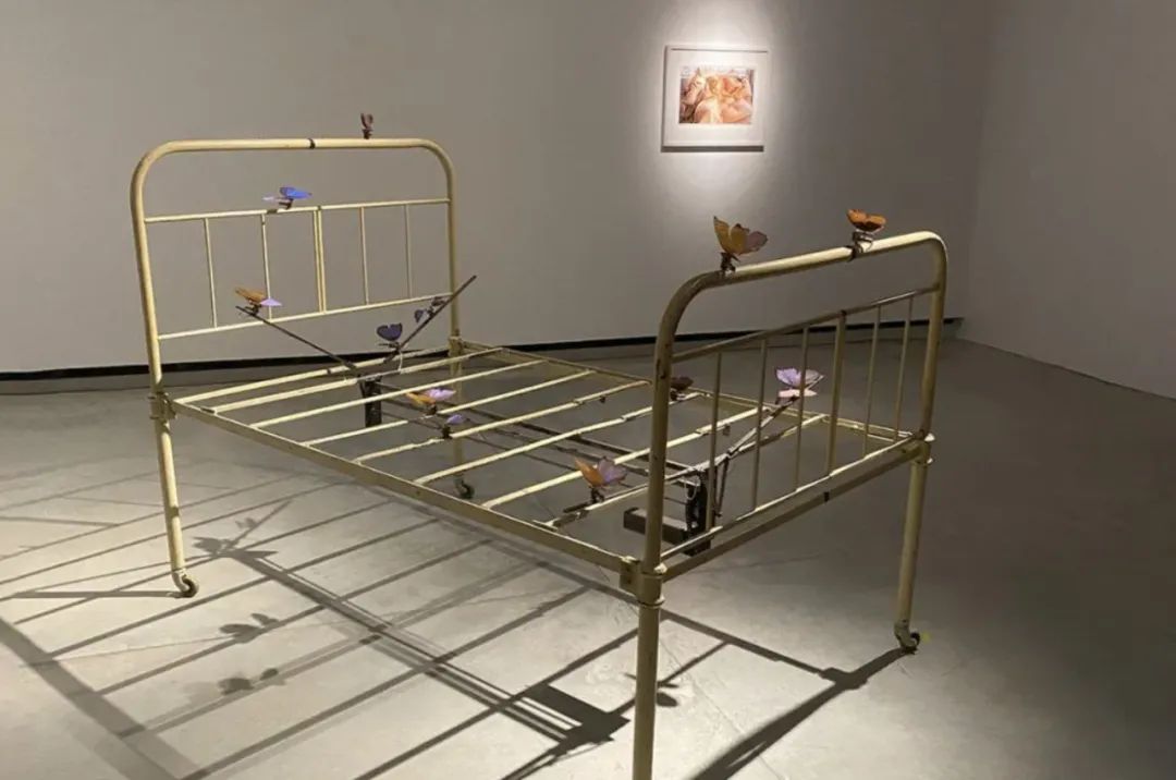 德国艺术家瑞贝卡·霍恩是战后一代最具代表性的跨媒介创作者之一。《恋人的床》中,一架带有古董疗养院风格的床架上,栖息着数只可被机械驱动的蝴蝶。“蝴蝶”作为霍恩艺术语汇中最具辨识度的意象,在此翩然扇动,将静物、记忆与生命之脆弱,交织成一场充满诗意的私密仪式。