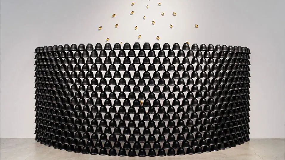 《莲之声》最初于1993年首届亚太当代艺术三年展展出,此次呈现是首次完全依照艺术家的原始构思实现。早期的澳大利亚版本因资源与空间所限,仅悬挂了350口钟。而在此次展出的最终版本中,500口钟完整重现,终于营造出布恩玛在几十年前所构想的沉浸式冥想场域。这件作品创作于艺术家得知妻子癌症诊断之后,其宁静深邃的声响空间,既是对病痛与生命的沉思,也成为一场超越时间的悼念,布恩玛本人亦于2000年因癌症逝世。