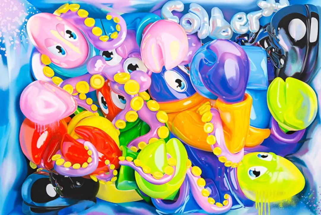 菲利普·考尔伯特与Aruta Soup均从流行文化、街头文化及当代媒体图像中汲取灵感,却以截然不同的视觉语言将其转化为创作。考尔伯特通过其高度饱和、戏谑强烈的视觉系统,以及标志性的“龙虾”角色,构建了一个荒诞而绚丽的超现实剧场,直指消费主义、数字异化与现代生存的寓言。相比之下,Aruta Soup的作品则呈现出一种插画式的街头美学,笔触灵动且充满叙事性。他在画面中融入天真幻想与社会体察,常常精准捕捉都市环境中的喧闹活力与日常诗意。