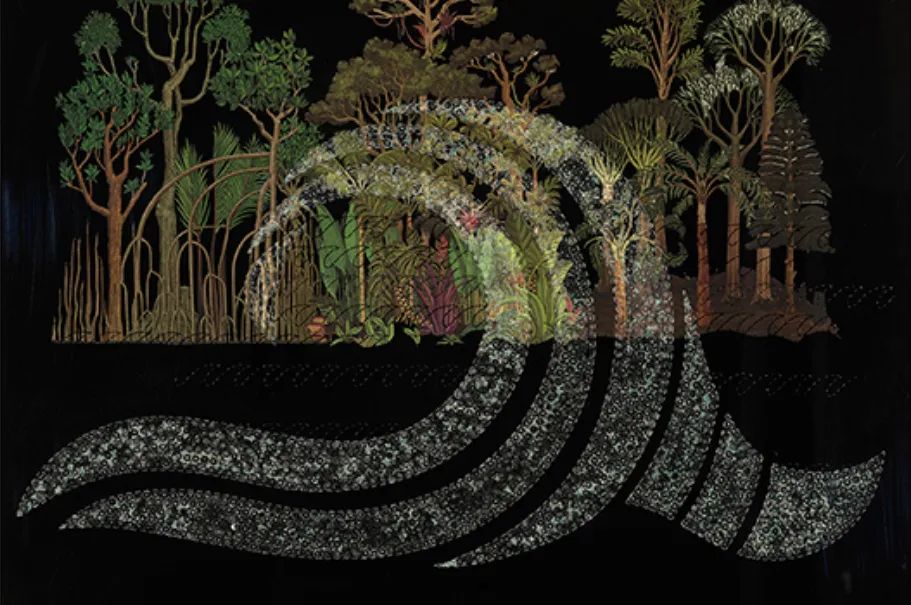 此次在新加坡的首次个展,艺术家带来了一系列新近创作。展览延续了其在美国博物馆个展的脉络,集中呈现色彩浓郁的综合材料拼贴、沉浸式大型光影装置、树脂绘画以及精心刺绣的纸本作品。通过这些媒介,她持续叩问种族、性别、殖民历史、文化认同,以及人与自然的关系等复杂而迫切的当代议题。