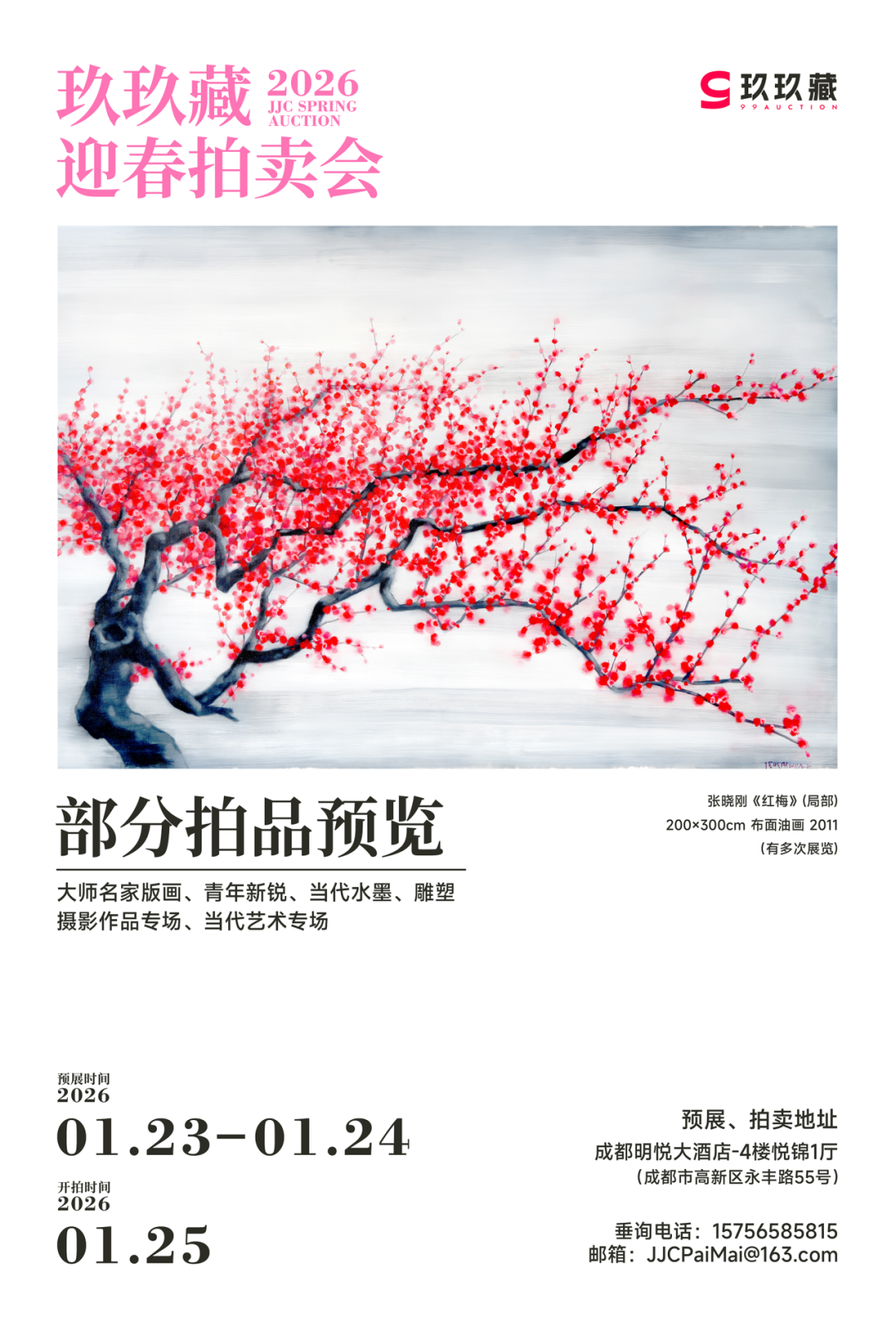 2026年1月25日,“玖玖藏迎春拍卖会”将于成都明悦大酒店举槌。本次拍卖会立足西南,放眼全球,精心筹划六大专场,并特别呈献“大师手泽”国际现当代艺术展,以多元的艺术维度和极具深度的学术视野,为藏家奉上一场新春艺术盛宴。