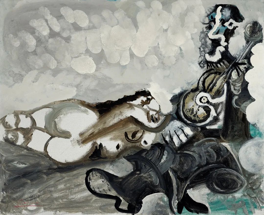 创作于1967年的《侧卧裸女与音乐家》堪称毕加索经典主题的浪漫变奏,亦是毕加索致敬古典大师的代表作品之一。自1963年起,毕加索开始创作极具代表性的“画家与模特”系列,在后期的作品中,画家的形象有时会转化为音乐家,一如本作所示,将原本的画室场景升华为充满浪漫情调的亲密布景。