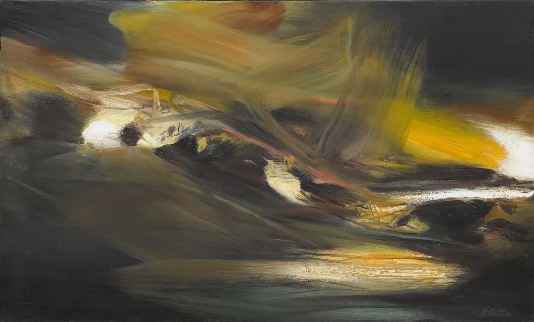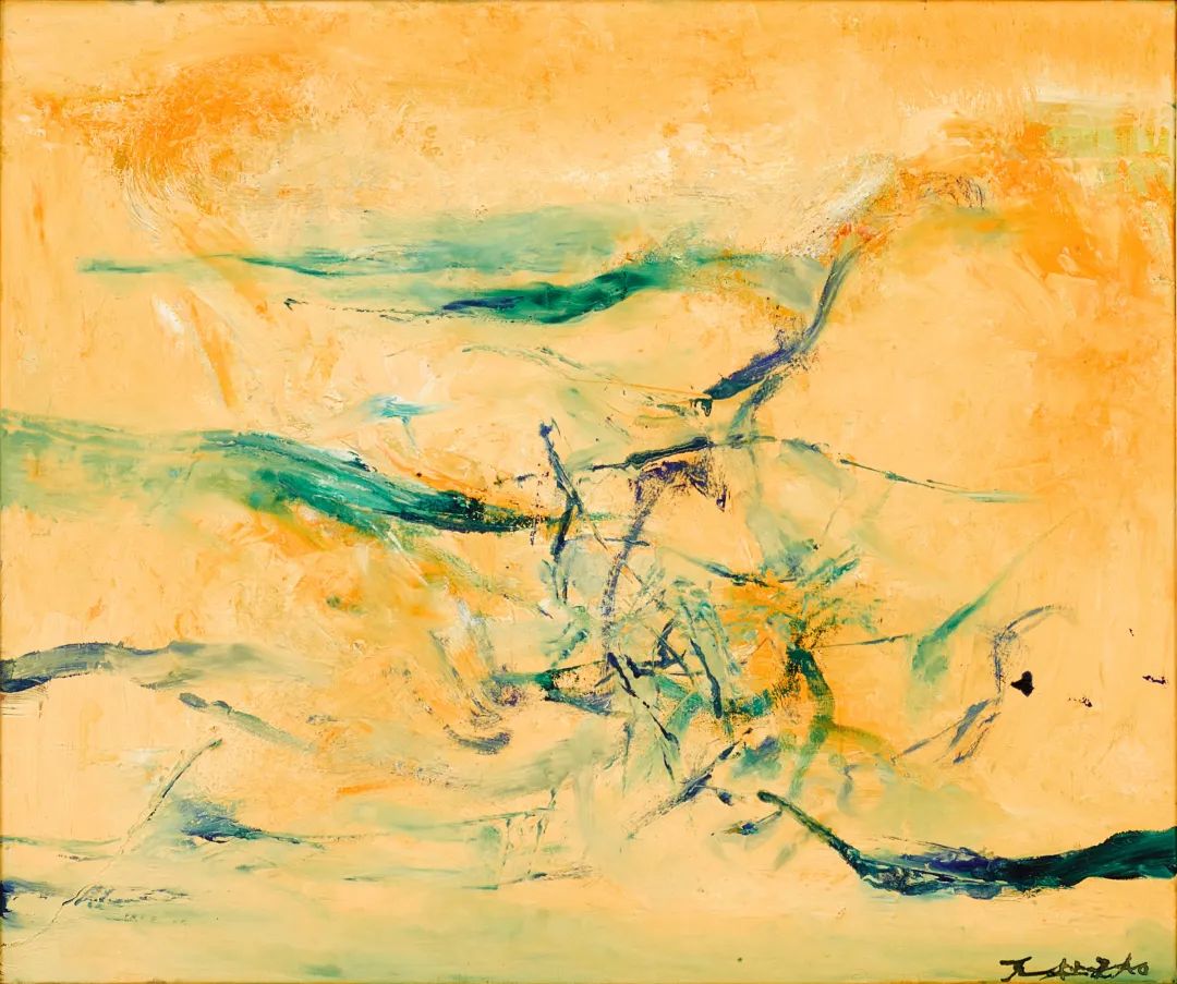 赵无极的《无题》(Sans titre)创作于2004年,正值艺术家创作生涯的巅峰,此时他已当选为法国美术院院士,并在法国举办了重要的回顾展。这幅作品展现了金黄色、柔和金发色和翡翠绿色的灿烂色调,构图反映了赵无极成熟的艺术风格,融合了印象派的色彩与中国水墨画的精神和空间哲学。