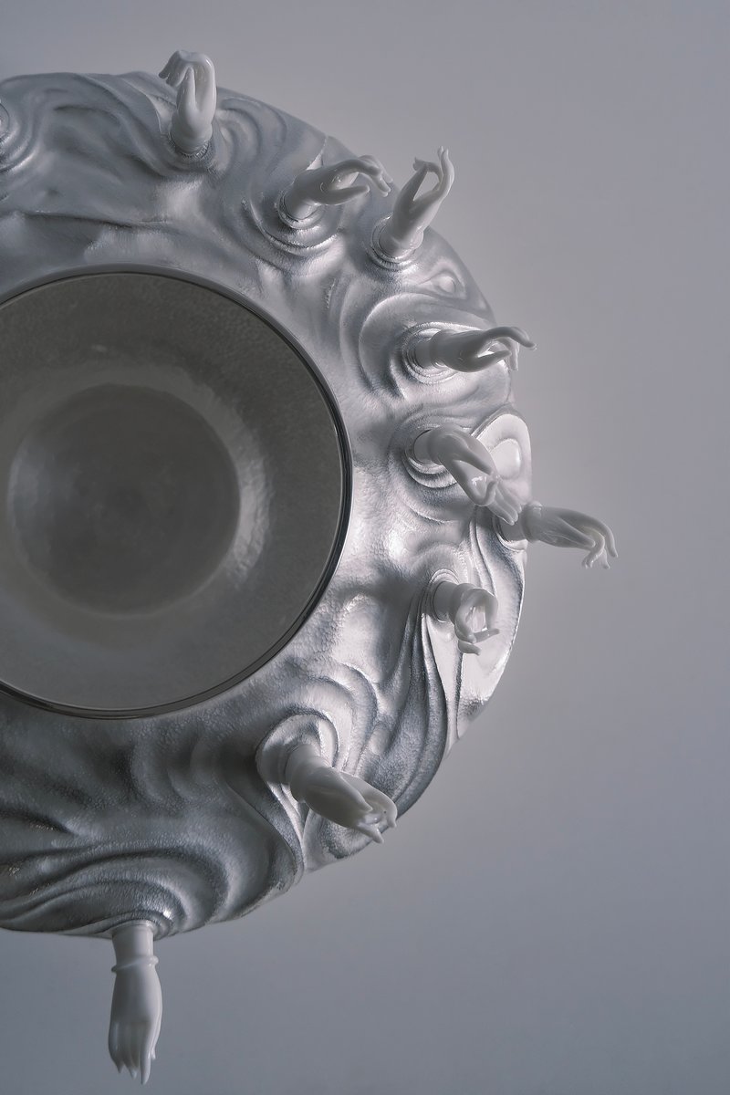 银与瓷,一样的白净。以坚硬的材质刻画柔美的线条感,两种不同的传统工艺经现代设计相结合,创作出具有个人观念的作品。《融》的线条灵感主要来源于中国传统人物雕塑与画作。银如衣褶,有“吴带当风”式的飘逸,佛像雕塑手部造型轻曲柔和,宁静自然,含圆满之意。材料的融合,刚与柔的视觉冲突,形成疏密对比强烈的节奏感。