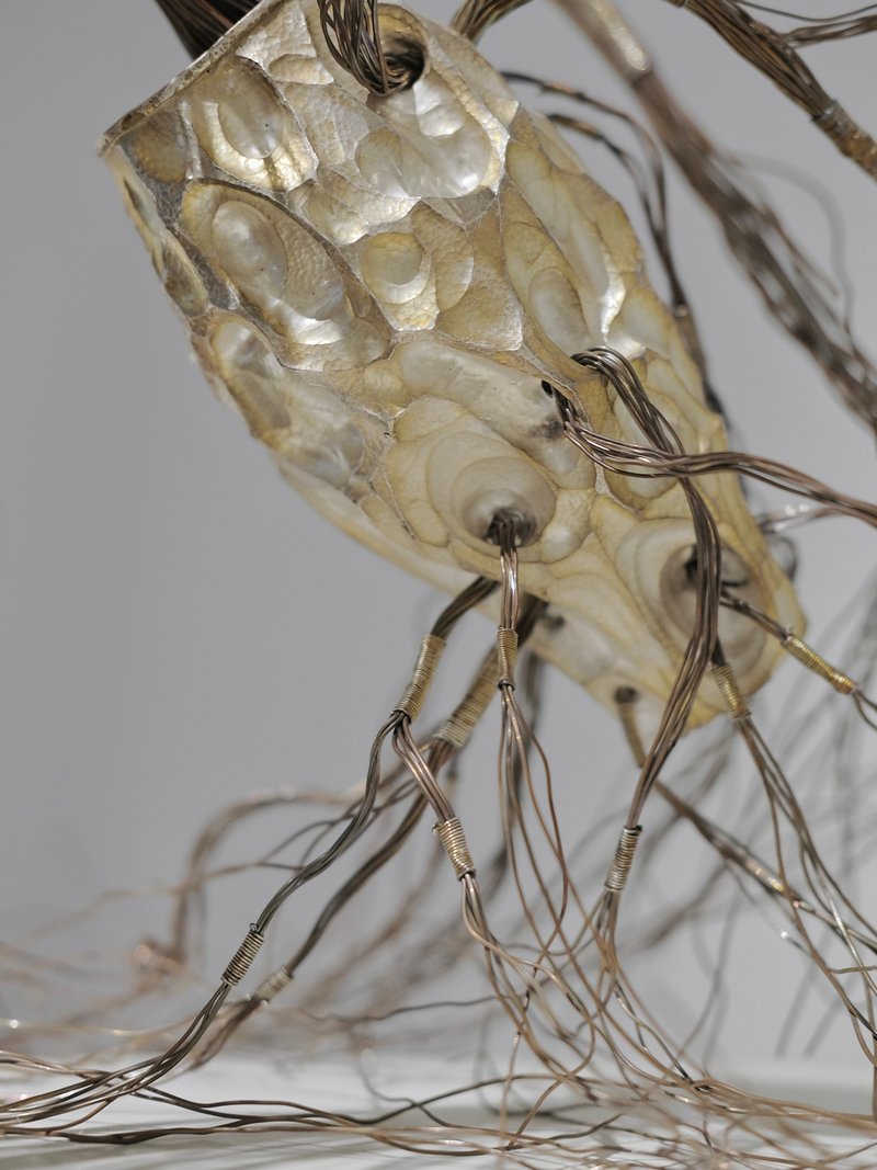 将技法创新与思想创意相结合 ,综合使用不同类型的金属材料 。以银锻造出生根发芽的种子 ,干净纯粹 ,有如一颗强有力的心脏 。铜丝表现种子的根系与人体的脉络 ,用冰冷的金属展现生命的张力 。我们哀叹时间的消亡 ,却依然心存对生的向往。