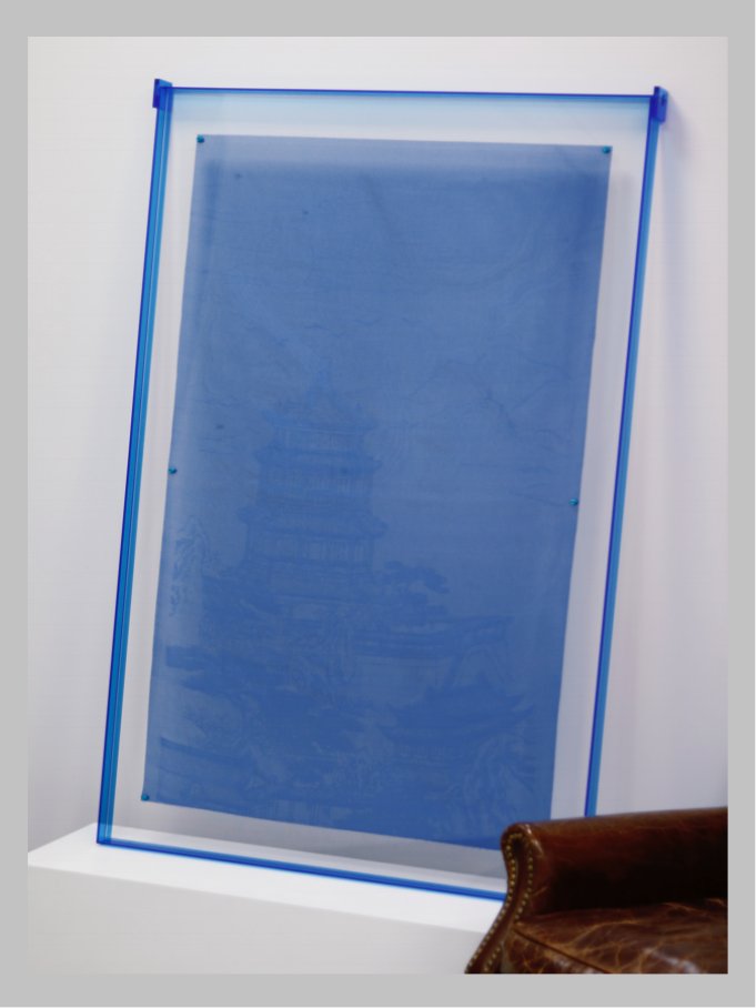 洪岩教授以苏罗提花为基础,将传统丝织的结构逻辑转 译为当代设计语言。经纬之间,不仅是图案的生成,更 是一种秩序与系统的延续。古老的技艺在新的方法中被 重新组织,成为当代生活美学的一部分。与前厅金属、 玻璃等与截然不同质感的材料共同感受传统的技艺与作的痕迹在当代形式中的重新感知,在这里材料不再只是工艺的归属,而成为连接记忆与当下生活的媒介。他的作品中,非遗技艺被视为一种开放的创作方法,而非 固定的形式来源。他从当代生活方式与审美经验出发,将传统技艺进行跨媒介、跨尺度的转译,使其自然融入现代居住、穿着与使用场景之中。作品强调“使用中的美感”,让非遗在当下语境中获得新的生命节奏。