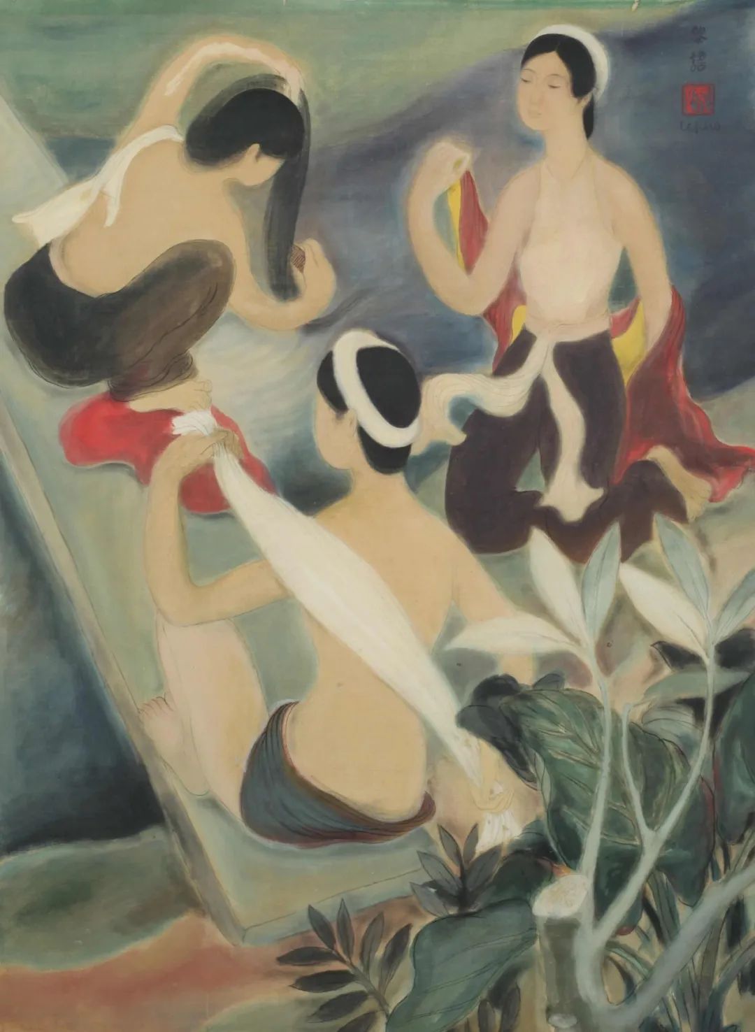 黎谱出生于越南的尊贵家族,很早便展示了他的艺术才华。 他在1925年成为中南半岛美术学院的第一届学生,在此,他尝试了各种越南的传统艺术媒材和创作手法,并在绢本绘画中展现了独特的才华。 1937年,他在巴黎国际艺术博览会展览后,选择定居于巴黎继续发展艺术事业。 黎谱移居巴黎后迅速在画坛获得成功,他开始在巴黎及其他地区的沙龙和画廊展出,与其他越南艺术家梅忠恕和武高谈并驻一堂。 《三位浴者》创作于约1938年,正值此巅峰时期。