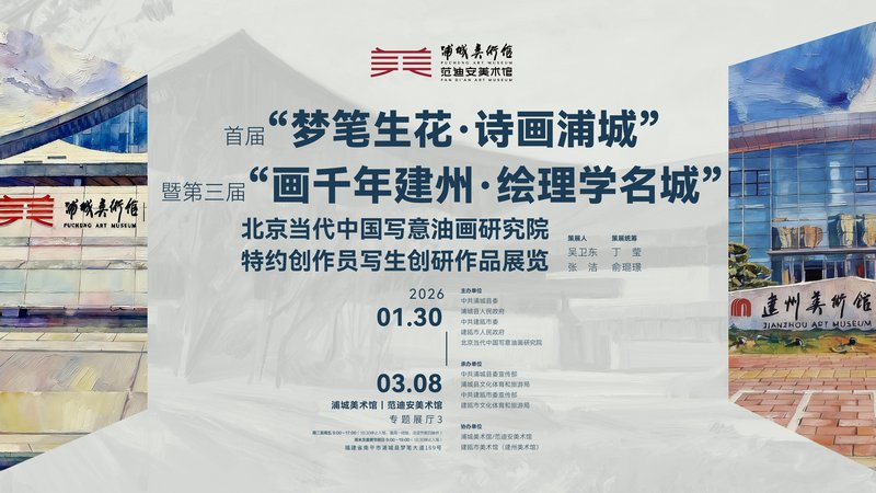 2026年1月30日,“首届‘梦笔生花·诗画浦城’暨第三届‘画千年建州·绘理学名城’北京当代中国写意油画研究院特约创作员写生创研作品展”在浦城美术馆/范迪安美术馆正式开展。本次活动由中共浦城县委、浦城县人民政府,中共建瓯市委、建瓯市人民政府与北京当代中国写意油画研究院联合主办,在中国美术家协会范迪安主席指导下精心筹备,既是写意油画艺术与闽北千年文脉的深情对话,更是浦城、建瓯两地文旅融合、共筑文化高地的生动实践,为深入贯彻落实习近平文化思想、推动优质文化资源下沉基层写下了浓墨重彩的一笔。
