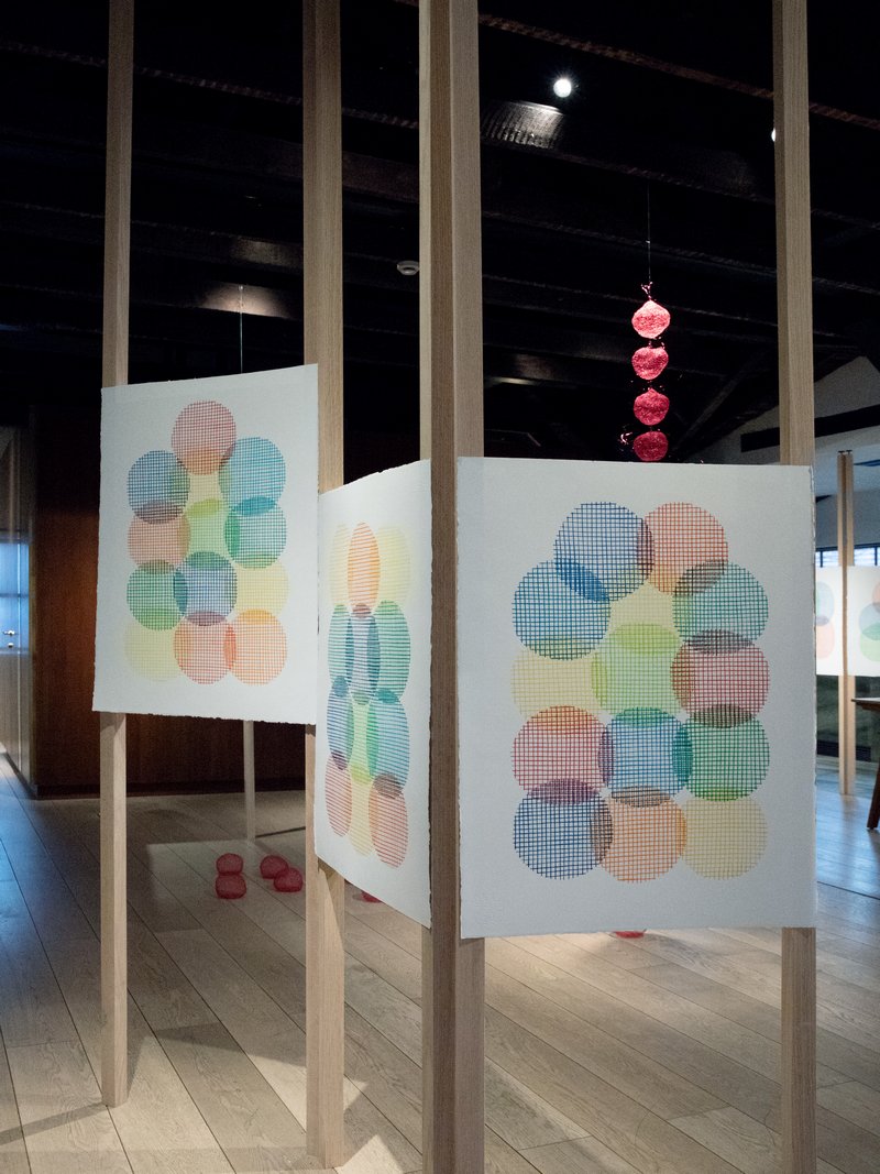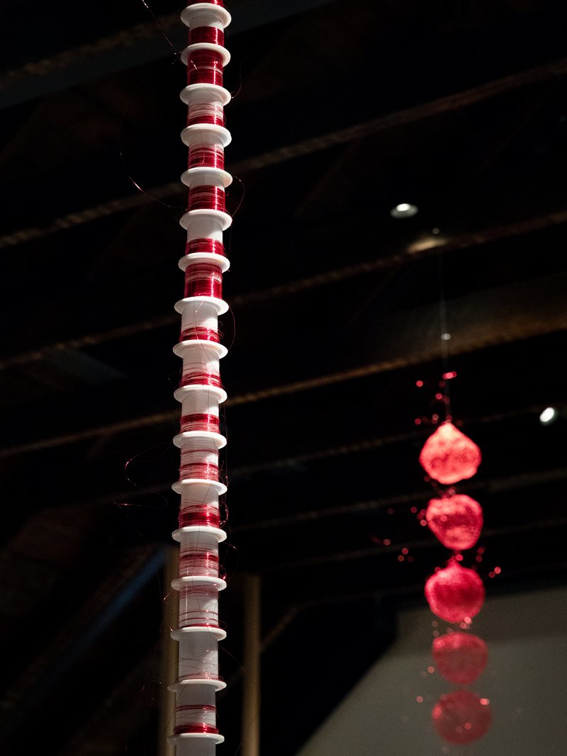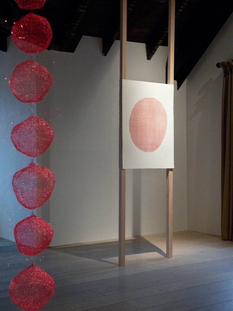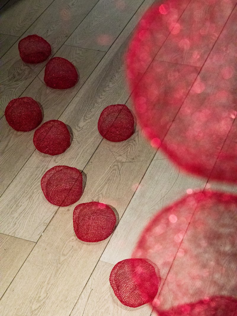 展览中弥漫的红色并非偶然,而是源于外部环境触发的感性转向。艺术家初到上海时,恰逢农历新年临近,在豫园小商品市场采购材料的过程中,她被铺天盖地的红色装饰、春联和红灯所包围,受到了强烈的色彩冲击。这一相遇与她作品中持续存在的、具有精神性与生命隐喻的红色产生了共振,从而自然而然地主导了本次驻留的视觉基调。这成为连接在地体验与个人美学的纽带,使日常色彩脱离了原有符号体系,与艺术家关于“此时此地”的独特思考相互重叠。
