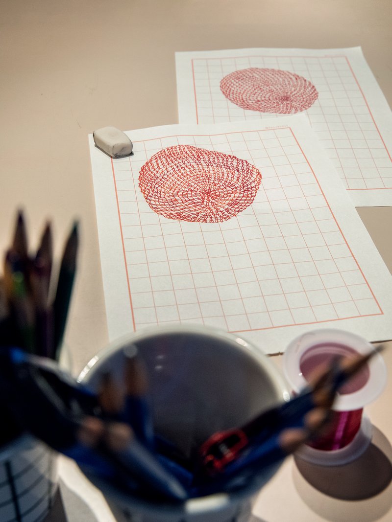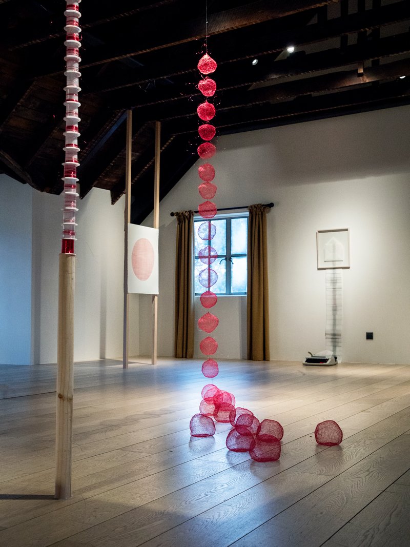 同时,她每日绘制一幅由横竖直线叠加构成的圆形绘画,在逐渐增加的圆形数量中记录时间的积累与节奏。这一系列是艺术家长期持续的《制作色彩(Making Color)》与《制作光(Making Light)》绘画实践的延伸。她仅使用色彩三原色与光的三原色来绘制圆形,在重复之中探究色与光生成的根源性结构,并将其与另一个根源性命题——时间相连。而在田字格本上绘制的三十张红色球体图像,则是将时间单位转化为感性符号的尝试,揭示了重复之中生成的微妙差异。它们与编织作品共同在空间中构建了一个多维的计时系统——一个垂直坠落,一个水平延展;一个关乎虚空与重力,一个关乎色彩与光的本源与知觉。
