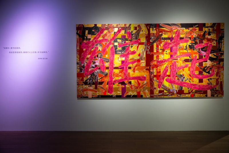 走进“廿四小时”版块,你很难不被这两幅大型绘画击中。《雄起》是红与黄的烈焰,像火锅沸腾时的第一股蒸汽,像麻将桌上掷出“杠上花”的那一声脆响。艺术家吴谦说,四川方言里“雄起”二字,把四川人骨子里自强不息、勇于拼搏的“辣劲” 体现得淋漓尽致。转身几步,便是《巴适》——平静的蓝辅以灵动的绿,像是在茶馆竹椅上看盖碗里茶叶沉下去、日光斜过来。一刚一柔,一张一弛,这正是成都人的一体两面:拼的时候不留余力,闲的时候心安理得。