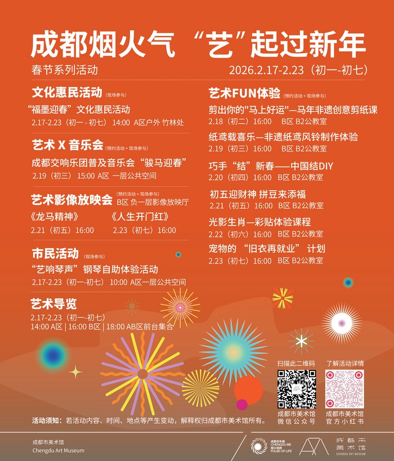整个春节长假期间,观众在美术馆将度过一个有艺术年味的春节。成都交响乐团将在大年初三举办“骏马迎春——公益音乐会”;“福墨迎春”文化惠民艺术活动可自助拓印、写福、写春联,让市民在墨香中传递祝福;更有多项非遗手工体验,巧妙融入“马年”的元素,让参与者在剪纸、扎纸鸢风铃、编中国结的深度互动中,感受传统手工艺的魅力。