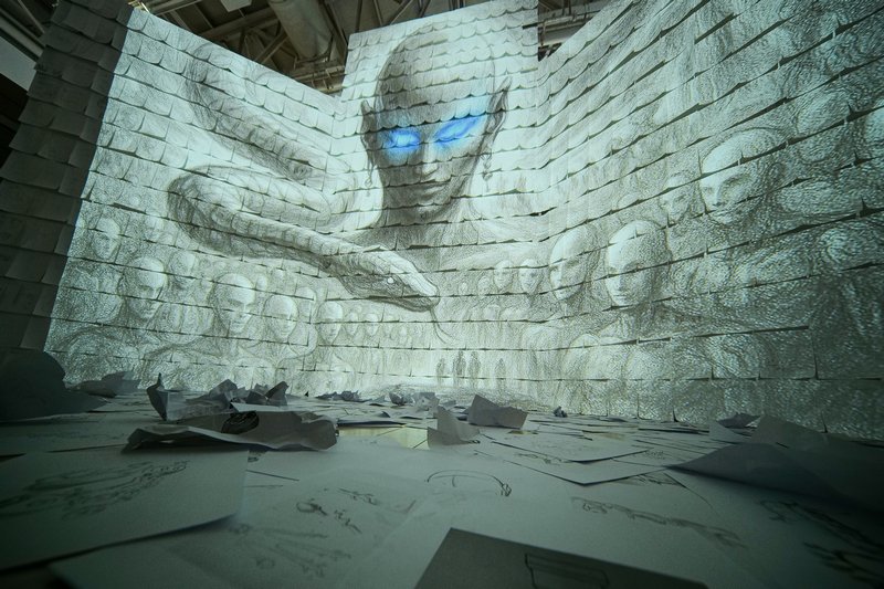 在展陈设计上,展览运用了大量具有“奇观”特征的景观式空间设置,以剧场与迷宫为核心结构,构建出一个可被行走、穿越与观看的叙事现场。展览共呈现艺术家重要作品约50件/套,涵盖绘画、影像、装置、文献等多种媒介。观众在展厅中并非沿着线性路径观看作品,而是在不断转向、回返与迷失中进入艺术家所构建的时间与身份叙事,使观看本身成为一种被纳入作品结构的经验。