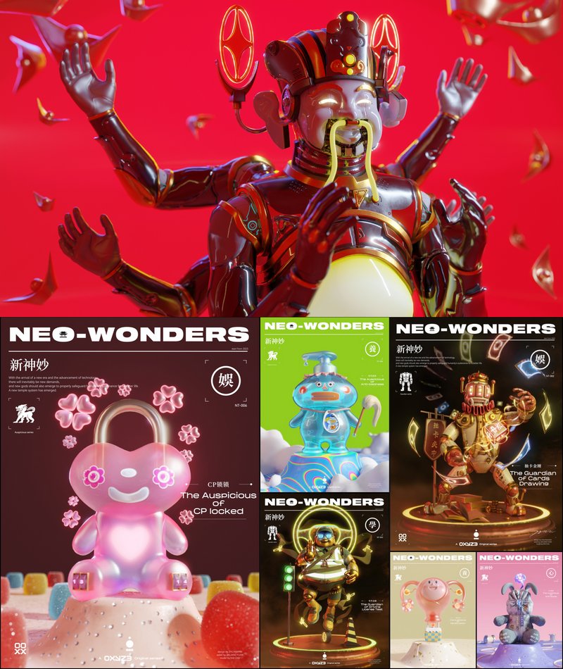陈陈陈/轴厂,《新神妙》,2023年,IP创作/品牌设计,尺寸可变;多媒体互动装置,尺寸可变;IP手办,3D打印,尺寸可变。