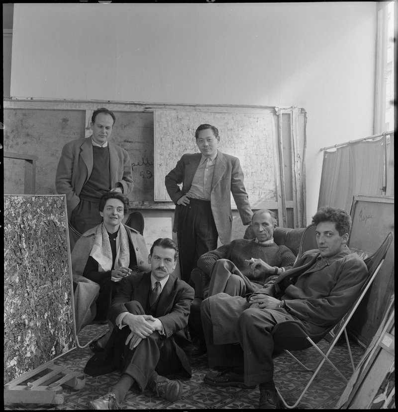 艺术家雅克·杰尔曼、玛丽亚·埃伦娜·维埃拉·达席尔瓦、赵无极、乔治·马修、及尚·保罗·里奥佩尔,以及艺术经纪人皮耶·洛布于1953年在巴黎第六区美术街2号的皮耶画廊合影