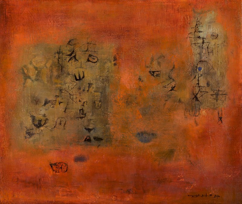 另一亮点作品《星火守护者》来源不凡,原为代理赵无极逾30年的法兰西画廊总监米里安·普雷沃(Myriam Prévot)珍藏。此作为艺术家最早期的抽象尝试之一,画中具象元素逐渐消融,转化为受中国古代甲骨文启发的抽象符号,标志其风格的关键转折。